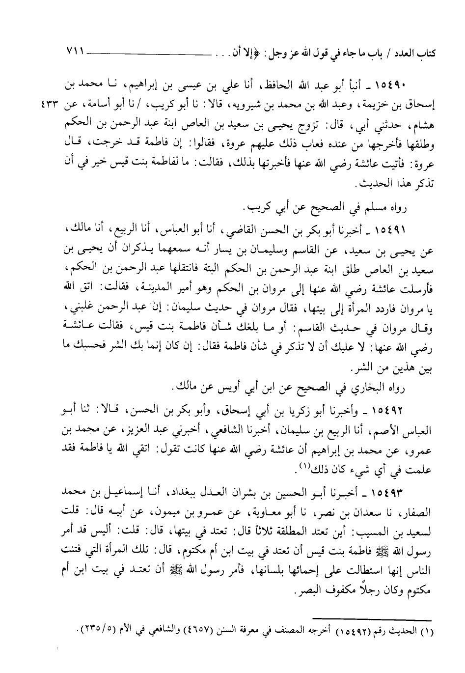 15490 - أنبأ أَبُو عَبْدِ اللهِ الْحَافِظُ، أنا عَلِيُّ بْنُ عِيسَى بْنِ إِبْرَاهِيمَ، نا مُحَمَّدُ بْنُ إِسْحَاقَ بْنِ خُزَيْمَةَ، وَعَبْدُ اللهِ بْنُ مُحَمَّدِ بْنِ شِيرَوَيْهِ قَالَا: نا أَبُو كُرَيْبٍ، نا أَبُو أُسَامَةَ، عَنْ هِشَامٍ، حَدَّثَنِي أَبِي قَالَ: تَزَوَّجَ يَحْيَى بْنُ سَعِيدِ بْنِ الْعَاصِ ابْنَةَ عَبْدِ الرَّحْمَنِ بْنِ الْحَكَمِ §وَطَلَّقَهَا فَأَخْرَجَهَا مِنْ عِنْدِهِ فَعَابَ ذَلِكَ عَلَيْهِمْ عُرْوَةُ فَقَالُوا: إِنَّ فَاطِمَةَ قَدْ خَرَجَتْ قَالَ عُرْوَةُ: فَأَتَيْتُ عَائِشَةَ رَضِيَ اللهُ عَنْهَا فَأَخْبَرْتُهَا بِذَلِكَ فَقَالَتْ: " مَا لِفَاطِمَةَ بِنْتِ قَيْسٍ خَيْرٌ فِي أَنْ تَذْكُرَ هَذَا الْحَدِيثَ " رَوَاهُ مُسْلِمٌ فِي الصَّحِيحِ، عَنْ أَبِي كُرَيْبٍ