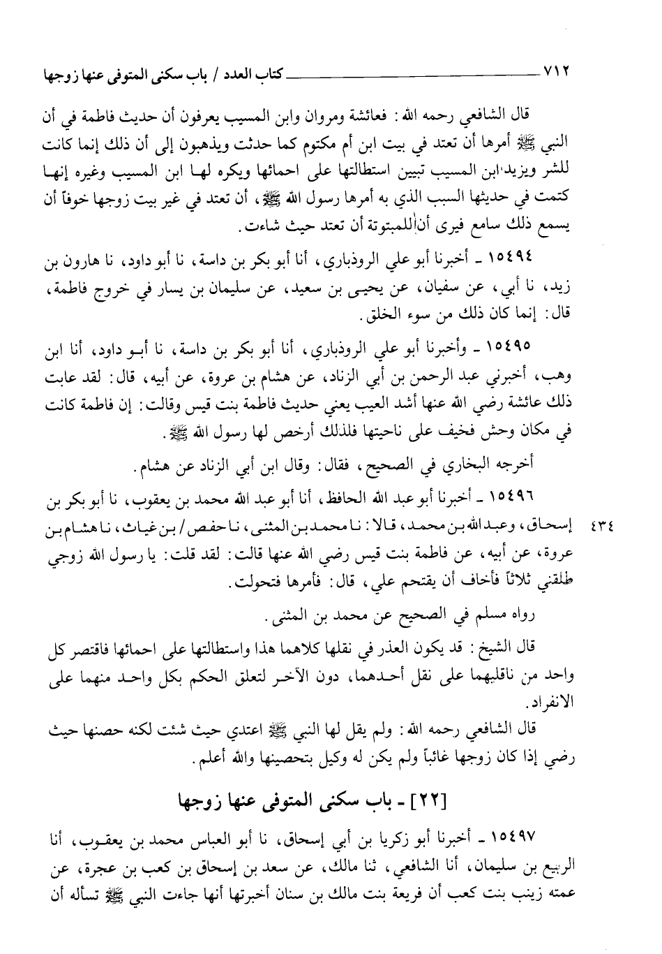 15497 - أَخْبَرَنَا أَبُو زَكَرِيَّا بْنُ أَبِي إِسْحَاقَ، نا أَبُو الْعَبَّاسِ مُحَمَّدُ بْنُ يَعْقُوبَ أنا الرَّبِيعُ بْنُ سُلَيْمَانَ، أنا الشَّافِعِيُّ، ثنا مَالِكٌ، عَنْ سَعْدِ بْنِ إِسْحَاقَ بْنِ كَعْبِ بْنِ عُجْرَةَ، عَنْ عَمَّتِهِ زَيْنَبَ بِنْتِ كَعْبٍ أَنَّ فُرَيْعَةَ بِنْتَ مَالِكِ بْنِ سِنَانٍ أَخْبَرَتْهَا أَنَّهَا جَاءَتِ النَّبِيَّ صَلَّى اللهُ عَلَيْهِ وَسَلَّمَ تَسْأَلُهُ أَنْ -[713]- تَرْجِعَ إِلَى أَهْلِهَا فِي بَنِي خُدْرَةَ وَأَنَّ زَوْجَهَا خَرَجَ فِي طَلَبِ أَعْبُدٍ لَهُ أَبَقُوا حَتَّى إِذَا كَانُوا بِطَرَفِ الْقَدُومِ لَحِقَهُمْ فَقَتَلُوهُ فَسَأَلْتُ رَسُولَ اللهِ صَلَّى اللهُ عَلَيْهِ وَسَلَّمَ أَنِّي أَرْجِعُ إِلَى أَهْلِي فَإِنَّ زَوْجِي لَمْ يَتْرُكْنِي فِي مَسْكَنٍ يَمْلِكُهُ قَالَتْ: فَقَالَ رَسُولُ اللهِ صلَّى الله عَلَيْهِ وَسَلَّمَ: " نَعَمْ " فَانْصَرَفْتُ حَتَّى إِذَا كُنْتُ فِي الْحُجْرَةِ أَوْ فِي الْمَسْجِدِ دَعَانِي أَوْ أَمَرَنِي فَدُعِيتُ لَهُ قَالَ: فَكَيْفَ قلت: فَرَدَّدْتُ عَلَيْهِ الْقِصَّةَ الَّتِي ذَكَرْتُ لَهُ مِنْ شَأْنِ زَوْجِي فَقَالَ: " §امْكُثِي فِي بَيْتِكِ حَتَّى يَبْلُغَ الْكِتَابُ أَجَلَهُ " قَالَتْ: فَاعْتَدَدْتُ فِيهِ أَرْبَعَةَ أَشْهُرٍ وَعَشْرًا، فَلَمَّا كَانَ عُثْمَانُ أَرْسَلَ إِلِيَّ فَسَأَلَنِي عَنْ ذَلِكَ فَأَخْبَرْتُهُ فَاتَّبَعَهُ وَقَضَى بِهِ