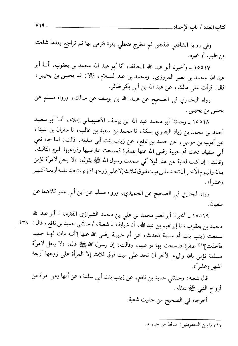 15519 - أَخْبَرَنَا أَبُو نَصْرٍ مُحَمَّدُ بْنُ عَلِيِّ بْنِ مُحَمَّدٍ الشِّيرَازِيُّ الْفَقِيهُ نا أَبُو عَبْدِ اللهِ مُحَمَّدُ بْنُ يَعْقُوبَ نا إِبْرَاهِيمُ بْنُ عَبْدِ اللهِ، أنا شَبَابَةُ، نا شُعْبَةُ، حَدَّثَنِي حُمَيْدُ بْنُ نَافِعٍ قَالَ: سَمِعْتُ زَيْنَبَ بِنْتَ أُمِّ سَلَمَةَ، تُحَدِّثُ عَنْ أُمِّ حَبِيبَةَ رَضِيَ اللهُ عَنْهَا أَنَّهُ مَاتَ لَهَا حَمِيمٌ فَأَخَذَتْ صُفْرَةً فَمَسَحَتْ بِهَا ذِرَاعَيْهَا وَقَالَتْ: إِنَّ رَسُولَ اللهِ صَلَّى اللهُ عَلَيْهِ وَسَلَّمَ قَالَ: §" لَا يَحِلُّ لِامْرَأَةٍ مُسْلِمَةٍ تُؤْمِنُ بِاللهِ وَالْيَوْمِ الْآخِرِ أَنْ تُحِدَّ عَلَى مَيِّتٍ فَوْقَ ثَلَاثٍ إِلَّا الْمَرْأَةَ عَلَى زَوْجِهَا أَرْبَعَةَ أَشْهُرٍ وَعَشْرًا " قَالَ شُعْبَةُ: وَحَدَّثَنِي حُمَيْدُ بْنُ نَافِعٍ عَنْ زَيْنَبَ بِنْتِ أَبِي سَلَمَةَ عَنْ أُمِّهَا وَعَنِ امْرَأَةٍ مِنْ أَزْوَاجِ النَّبِيِّ صَلَّى اللهُ عَلَيْهِ وَسَلَّمَ بِمِثْلِهِ أَخْرَجَاهُ فِي الصَّحِيحِ، مِنْ حَدِيثِ شُعْبَةَ -[720]-