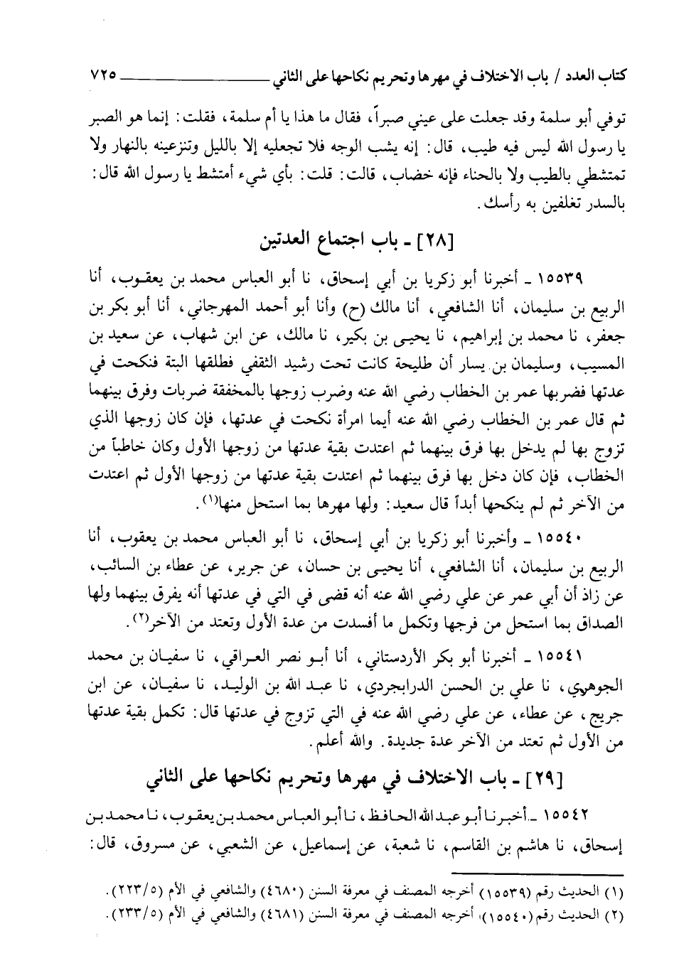 15539 - أَخْبَرَنَا أَبُو زَكَرِيَّا بْنُ أَبِي إِسْحَاقَ، نا أَبُو الْعَبَّاسِ مُحَمَّدُ بْنُ يَعْقُوبَ أنا الرَّبِيعُ بْنُ سُلَيْمَانَ، أنا الشَّافِعِيُّ، أنا مَالِكٌ، ح وَأنا أَبُو أَحْمَدَ الْمِهْرَجَانِيُّ، أنا أَبُو بَكْرِ بْنُ جَعْفَرٍ، نا مُحَمَّدُ بْنُ إِبْرَاهِيمَ، نا يَحْيَى بْنُ بُكَيْرٍ، نا مَالِكٌ، عَنِ ابْنِ شِهَابٍ، عَنْ سَعِيدِ بْنِ الْمُسَيِّبِ، وَسُلَيْمَانَ بْنِ يَسَارٍ، أَنَّ طُلَيْحَةَ كَانَتْ تَحْتَ رُشَيْدٍ الثَّقَفِيِّ فَطَلَّقَهَا الْبَتَّةَ فَنَكَحَتْ فِي عِدَّتِهَا فَضَرَبَهَا عُمَرُ بْنُ الْخَطَّابِ رَضِيَ اللهُ عَنْهُ وَضَرَبَ زَوْجَهَا بِالْمِخْفَقَةِ ضَرَبَاتٍ وَفَرَّقَ بَيْنَهُمَا ثُمَّ قَالَ عُمَرُ بْنُ الْخَطَّابِ رَضِيَ اللهُ عَنْهُ: §" أَيُّمَا امْرَأَةٍ نَكَحَتْ فِي عِدَّتِهَا فَإِنْ كَانَ زَوْجُهَا الَّذِي تَزَوَّجَ بِهَا لَمْ يَدْخُلْ بِهَا فُرِّقَ بَيْنَهُمَا ثُمَّ اعْتَدَّتْ بَقِيَّةَ عِدَّتِهَا مِنْ زَوْجِهَا الْأَوَّلِ وَكَانَ خَاطِبًا مِنَ الْخُطَّابِ فَإِنْ كَانَ دَخَلَ بِهَا فُرِّقَ بَيْنَهُمَا ثُمَّ اعْتَدَّتْ بَقِيَّةَ عِدَّتِهَا مِنْ زَوْجِهَا الْأَوَّلِ ثُمَّ اعْتَدَّتْ مِنَ الآخَرِ ثُمَّ لَمْ يَنْكِحْهَا أَبَدًا " قَالَ سَعِيدٌ: " وَلَهَا مَهْرُهَا بِمَا اسْتَحَلَّ مِنْهَا "