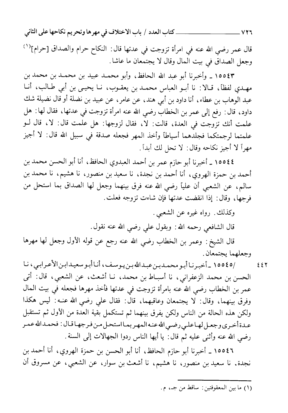 15545 - أَخْبَرَنَا أَبُو مُحَمَّدٍ عَبْدُ اللهِ بْنُ يُوسُفَ، أنا أَبُو سَعِيدِ بْنُ الْأَعْرَابِيِّ، نا الْحَسَنُ بْنُ مُحَمَّدٍ الزَّعْفَرَانِيُّ، نا أَسْبَاطُ بْنُ مُحَمَّدٍ، نا أَشْعَثُ، عَنِ الشَّعْبِيِّ قَالَ: أُتِيَ عُمَرُ بْنُ الْخَطَّابِ رَضِيَ اللهُ عَنْهُ بِامْرَأَةٍ §تَزَوَّجَتْ فِي عِدَّتِهَا فَأَخَذَ مَهْرَهَا فَجَعَلَهُ فِي بَيْتِ الْمَالِ وَفَرَّقَ بَيْنَهُمَا وَقَالَ: " لَا يَجْتَمِعَانِ وَعَاقَبَهُمَا " قَالَ: فَقَالَ عَلِيٌّ رَضِيَ اللهُ عَنْهُ: " لَيْسَ هَكَذَا وَلَكِنْ هَذِهِ الْجَهَالَةَ مِنَ النَّاسِ وَلَكِنْ يُفَرَّقُ بَيْنَهُمَا ثُمَّ تَسْتَكْمِلُ بَقِيَّةَ الْعِدَّةِ مِنَ الْأَوَّلِ ثُمَّ تَسْتَقْبِلُ عِدَّةً أُخْرَى وَجَعَلَ لَهَا عَلِيٌّ رَضِيَ اللهُ عَنْهُ الْمَهْرَ بِمَا اسْتَحَلَّ مِنْ فَرْجِهَا قَالَ: فَحَمِدَ اللهَ عُمَرُ رَضِيَ اللهُ عَنْهُ وَأَثْنَى عَلَيْهِ ثُمَّ قَالَ: " يَا أَيُّهَا النَّاسُ رُدُّوا الْجَهَالِاتِ إِلَى السُّنَّةِ "