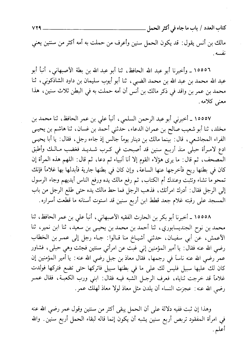 15558 - أَخْبَرَنَا أَبُو بَكْرِ بْنُ الْحَارِثِ الْفَقِيهُ الْأَصْبَهَانِيُّ، أنبأ عَلِيُّ بْنُ عُمَرَ الْحَافِظُ، ثنا مُحَمَّدُ بْنُ نُوحٍ الْجُنْدِيسَابُورِيُّ، ثنا أَحْمَدُ بْنُ مُحَمَّدِ بْنِ يَحْيَى بْنِ سَعِيدٍ، ثنا ابْنُ نُمَيْرٍ، ثنا الْأَعْمَشُ، عَنْ أَبِي سُفْيَانَ، حَدَّثَنِي أَشْيَاخٌ مِنَّا قَالُوا: جَاءَ رَجُلٌ إِلَى عُمَرَ بْنِ الْخَطَّابِ رَضِيَ اللهُ عَنْهُ فَقَالَ: يَا أَمِيرَ الْمُؤْمِنِينَ إِنِّي غِبْتُ عَنِ امْرَأَتِي سَنَتَيْنِ فَجِئْتُ وَهِيَ حُبْلَى فَشَاوَرَ عُمَرُ رَضِيَ اللهُ عَنْهُ نَاسًا فِي رَجْمِهَا فَقَالَ مُعَاذُ بْنُ جَبَلٍ رَضِيَ اللهُ عَنْهُ: " يَا أَمِيرَ الْمُؤْمِنِينَ إِنْ كَانَ لَكَ عَلَيْهَا سَبِيلٌ فَلَيْسَ لَكَ عَلَى مَا فِي بَطْنِهَا سَبِيلٌ فَاتْرُكْهَا حَتَّى تَضَعَ "، فَتَرَكَهَا §فَوَلَدَتْ غُلَامًا قَدْ خَرَجَتْ ثَنَايَاهُ فَعَرَفَ الرَّجُلُ الشَّبَهَ فِيهِ فَقَالَ: ابْنِي وَرَبِّ الْكَعْبَةِ , فَقَالَ عُمَرُ رَضِيَ اللهُ عَنْهُ: " عَجَزَتِ النِّسَاءُ أَنْ يَلِدْنَ مِثْلَ مُعَاذٍ لَوْلَا مُعَاذٌ لَهَلَكَ عُمَرُ " وَهَذَا إِنْ ثَبَتَ فَفِيهِ دَلَالَةٌ عَلَى أَنَّ الْحَمْلَ يَبْقَى أَكْثَرَ مِنْ سَنَتَيْنِ , وَقَوْلُ عُمَرَ رَضِيَ اللهُ عَنْهُ فِي امْرَأَةِ الْمَفْقُودِ تَرَبَّصُ أَرْبَعَ سِنِينَ يُشْبِهُ أَنْ يَكُونَ إِنَّمَا قَالَهُ لِبَقَاءِ الْحَمْلِ أَرْبَعَ سِنِينَ , وَاللهُ أَعْلَمُ