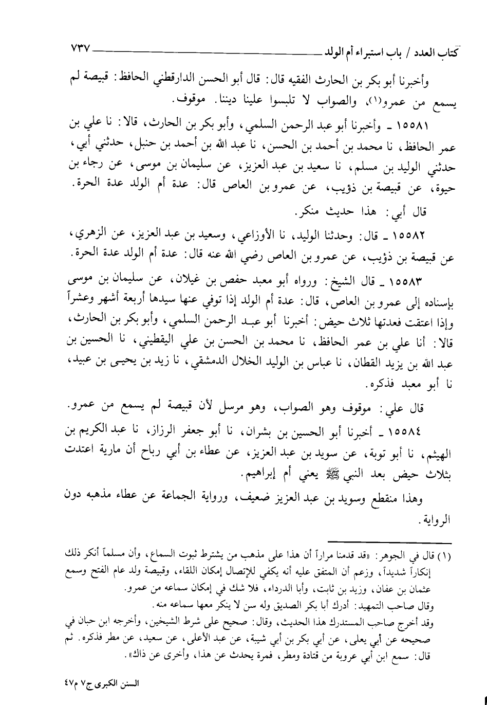 15583 - قَالَ الشَّيْخُ: وَرَوَاهُ أَبُو مَعْبَدٍ حَفْصُ بْنُ غَيْلَانَ، عَنْ سُلَيْمَانَ بْنِ مُوسَى، بِإِسْنَادِهِ إِلَى عَمْرِو بْنِ الْعَاصِ قَالَ: §" عِدَّةُ أُمِّ الْوَلَدِ إِذَا تُوُفِّيَ عَنْهَا سَيِّدُهَا أَرْبَعَةُ أَشْهُرٍ وَعَشْرًا وَإِذَا أُعْتِقَتْ فَعِدَّتُهَا ثَلَاثُ حِيَضٍ "، أَخْبَرَنَاهُ أَبُو عَبْدِ الرَّحْمَنِ السُّلَمِيُّ، وَأَبُو بَكْرِ بْنُ الْحَارِثِ قَالَا: أنا عَلِيُّ بْنُ عُمَرَ الْحَافِظُ، نا مُحَمَّدُ بْنُ الْحَسَنِ بْنِ عَلِيٍّ الْيَقْطِينِيُّ، نا الْحُسَيْنُ بْنُ عَبْدِ اللهِ بْنِ يَزِيدَ الْقَطَّانُ، نا عَبَّاسُ بْنُ الْوَلِيدِ الْخَلَّالُ الدِّمَشْقِيُّ، نا زَيْدُ بْنُ يَحْيَى بْنِ عُبَيْدٍ، نا أَبُو مَعْبَدٍ فَذَكَرَهُ قَالَ: عَلِيٌّ مَوْقُوفٌ وَهُوَ الصَّوَابُ وَهُوَ مُرْسَلٌ لِأَنَّ قَبِيصَةَ لَمْ يَسْمَعْ مِنْ عَمْرٍو