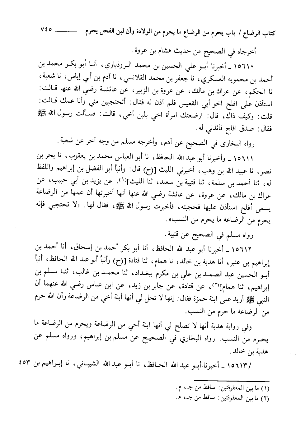 15611 - وَأَخْبَرَنَا أَبُو عَبْدِ اللهِ الْحَافِظُ، نا أَبُو الْعَبَّاسِ مُحَمَّدُ بْنُ يَعْقُوبَ، نا بَحْرُ بْنُ نَصْرٍ، نا عَبْدُ اللهِ بْنُ وَهْبٍ، أَخْبَرَنِي اللَّيْثُ، ح قَالَ: وَأنبأ أَبُو الْفَضْلِ بْنُ إِبْرَاهِيمَ وَاللَّفْظُ لَهُ، ثنا أَحْمَدُ بْنُ سَلَمَةَ، ثنا قُتَيْبَةُ بْنُ سَعِيدٍ، ثنا اللَّيْثُ، عَنْ يَزِيدَ بْنِ أَبِي حَبِيبٍ، عَنْ عِرَاكِ بْنِ مَالِكٍ، عَنْ عُرْوَةَ، عَنْ عَائِشَةَ رَضِيَ اللهُ عَنْهَا أَنَّهَا أَخْبَرَتْهُ أَنَّ عَمَّهَا مِنَ الرَّضَاعَةِ يُسَمَّى أَفْلَحُ اسْتَأْذَنَ عَلَيْهَا فَحَجَبَتْهُ فَأَخْبَرَتْ رَسُولَ اللهِ صَلَّى اللهُ عَلَيْهِ وَسَلَّمَ فَقَالَ لَهَا: " لَا تَحْتَجِبِي فَإِنَّهُ §يَحْرُمُ مِنَ الرَّضَاعَةِ مَا يَحْرُمُ مِنَ النَّسَبِ " رَوَاهُ مُسْلِمٌ فِي الصَّحِيحِ، عَنْ قُتَيْبَةَ