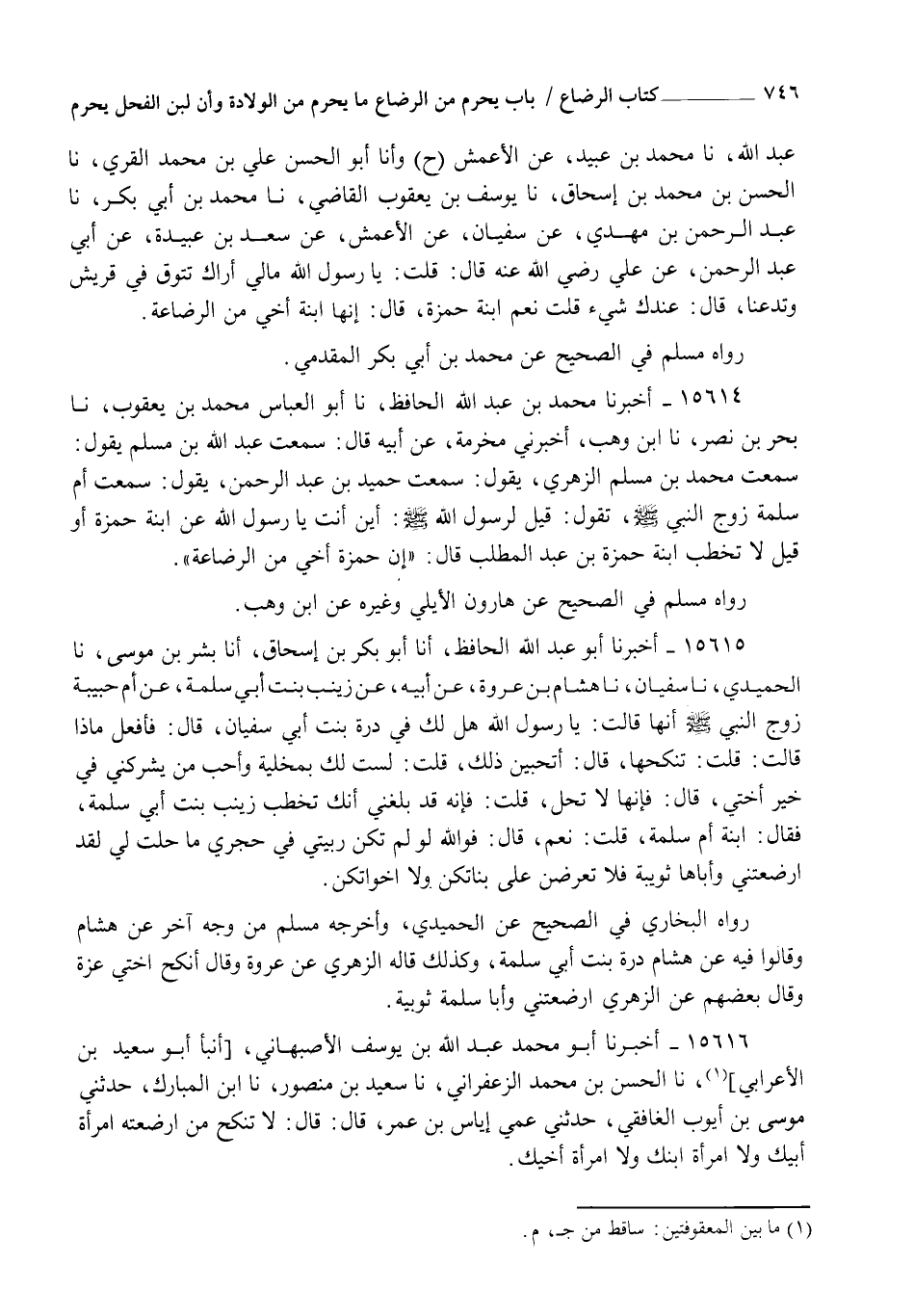 15614 - أَخْبَرَنَا مُحَمَّدُ بْنُ عَبْدِ اللهِ الْحَافِظُ، نا أَبُو الْعَبَّاسِ مُحَمَّدُ بْنُ يَعْقُوبَ، نا بَحْرُ بْنُ نَصْرٍ، نا ابْنُ وَهْبٍ، أَخْبَرَنِي مَخْرَمَةُ، عَنْ أَبِيهِ قَالَ: سَمِعْتُ عَبْدَ اللهِ بْنَ مُسْلِمٍ يَقُولُ: سَمِعْتُ مُحَمَّدَ بْنَ مُسْلِمٍ الزُّهْرِيَّ، يَقُولُ: سَمِعْتُ حُمَيْدَ بْنَ عَبْدِ الرَّحْمَنِ، يَقُولُ: سَمِعْتُ أُمَّ سَلَمَةَ زَوْجَ النَّبِيِّ صَلَّى اللهُ عَلَيْهِ وَسَلَّمَ تَقُولُ: قِيلَ لِرَسُولِ اللهِ صَلَّى اللهُ عَلَيْهِ وَسَلَّمَ: أَيْنَ أَنْتَ يَا رَسُولَ اللهِ عَنِ ابْنَةِ حَمْزَةَ أَوْ قِيلَ: لَا تَخْطُبُ ابْنَةَ حَمْزَةَ بْنِ عَبْدِ الْمُطَّلِبِ؟ قَالَ: " إِنَّ §حَمْزَةَ أَخِي مِنَ الرَّضَاعَةِ " رَوَاهُ مُسْلِمٌ فِي الصَّحِيحِ، عَنْ هَارُونَ الْأَيْلِيِّ وَغَيْرُهُ عَنِ ابْنِ وَهْبٍ