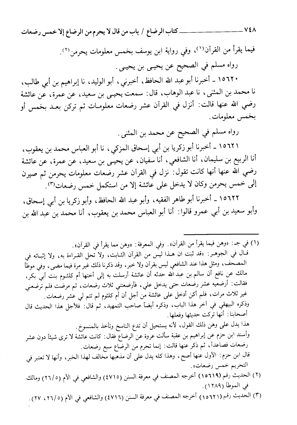 15621 - أَخْبَرَنَا أَبُو زَكَرِيَّا بْنُ أَبِي إِسْحَاقَ الْمُزَكِّي، نا أَبُو الْعَبَّاسِ مُحَمَّدُ بْنُ يَعْقُوبَ، أنا الرَّبِيعُ بْنُ سُلَيْمَانَ، أنا الشَّافِعِيُّ، أنا سُفْيَانُ، عَنْ يَحْيَى بْنِ سَعِيدٍ، عَنْ عَمْرَةَ، عَنْ عَائِشَةَ رَضِيَ اللهُ عَنْهَا أَنَّهَا كَانَتْ تَقُولُ " نَزَلَ فِي الْقُرْآنِ §عَشَرُ رَضَعَاتٍ مَعْلُومَاتٍ يُحَرِّمْنَ ثُمَّ صُيِّرْنَ إِلَى خَمْسٍ يُحَرِّمْنَ " وَكَانَ لَا يَدْخُلُ عَلَى عَائِشَةَ إِلَّا مَنِ اسْتَكْمَلَ خَمْسَ رَضَعَاتٍ