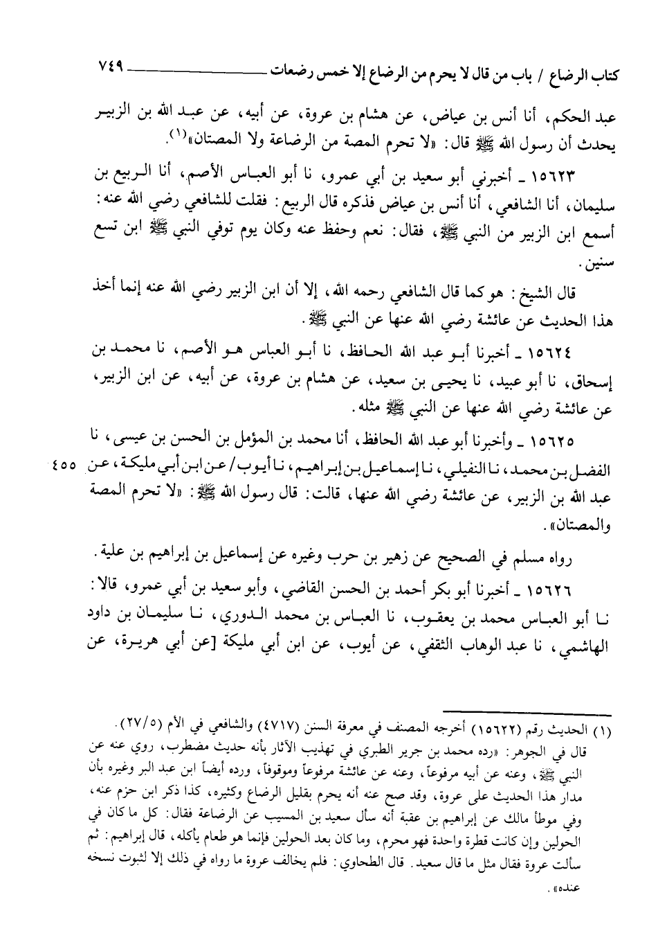 15625 - وَأَخْبَرَنَا أَبُو عَبْدِ اللهِ الْحَافِظُ، أنا مُحَمَّدُ بْنُ الْمُؤَمَّلِ بْنِ الْحَسَنِ بْنِ عِيسَى، نا الْفَضْلُ بْنُ مُحَمَّدٍ، نا النُّفَيْلِيُّ، نا إِسْمَاعِيلُ بْنُ إِبْرَاهِيمَ، نا أَيُّوبُ، عَنِ ابْنِ مُلَيْكَةَ، عَنْ عَبْدِ اللهِ بْنِ الزُّبَيْرِ، عَنْ عَائِشَةَ رَضِيَ اللهُ عَنْهَا قَالَتْ: قَالَ رَسُولُ اللهِ صَلَّى اللهُ عَلَيْهِ وَسَلَّمَ: " §لَا تُحَرِّمُ الْمَصَّةُ وَالْمَصَّتَانِ " رَوَاهُ مُسْلِمٌ فِي الصَّحِيحِ، عَنْ زُهَيْرِ بْنِ حَرْبٍ وَغَيْرِهِ عَنْ إِسْمَاعِيلَ بْنِ إِبْرَاهِيمَ ابْنِ عُلَيَّةَ