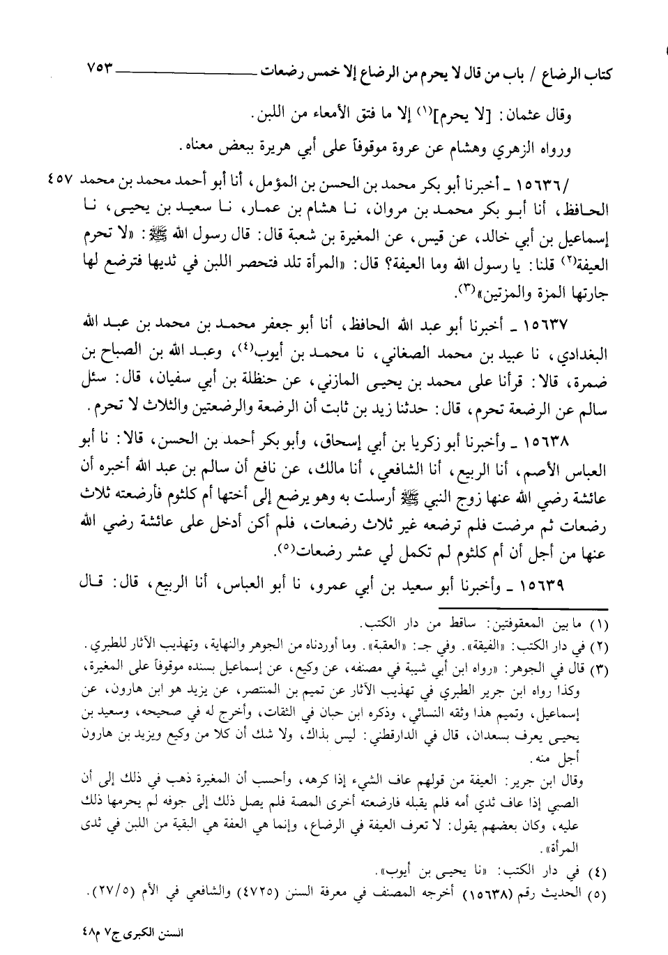 15638 - وَأَخْبَرَنَا أَبُو زَكَرِيَّا بْنُ أَبِي إِسْحَاقَ، وَأَبُو بَكْرٍ أَحْمَدُ بْنُ الْحَسَنِ قَالَا: نا أَبُو الْعَبَّاسِ الْأَصَمُّ، أنا الرَّبِيعُ، أنا الشَّافِعِيُّ، أنا مَالِكٌ، عَنْ نَافِعٍ، أَنَّ سَالِمَ بْنَ عَبْدِ اللهِ أَخْبَرَهُ أَنَّ عَائِشَةَ رَضِيَ اللهُ عَنْهَا زَوْجَ النَّبِيِّ صَلَّى اللهُ عَلَيْهِ وَسَلَّمَ أَرْسَلَتْ بِهِ وَهُوَ يَرْضَعُ إِلَى أُخْتِهَا أُمِّ كُلْثُومٍ §فَأَرْضَعَتْهُ ثَلَاثَ رَضَعَاتٍ ثُمَّ مَرِضَتْ فَلَمْ تُرْضِعْهُ غَيْرَ ثَلَاثِ رَضَعَاتٍ فَلَمْ أَكُنْ أَدْخُلُ عَلَى عَائِشَةَ رَضِيَ اللهُ عَنْهَا مِنْ أَجْلِ أَنَّ أُمَّ كُلْثُومٍ لَمْ تُكْمِلْ لِي عَشْرَ رَضَعَاتٍ "