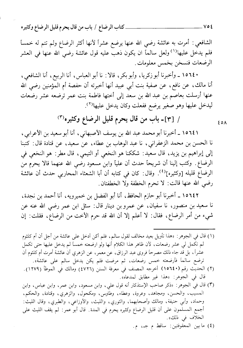 15641 - أَخْبَرَنَا أَبُو مُحَمَّدٍ عَبْدُ اللهِ بْنُ يُوسُفَ الْأَصْبَهَانِيُّ، أنا أَبُو سَعِيدِ بْنُ الْأَعْرَابِيِّ، نا الْحَسَنُ بْنُ مُحَمَّدٍ الزَّعْفَرَانِيُّ، نا عَبْدُ الْوَهَّابِ بْنُ عَطَاءٍ، عَنْ سَعِيدٍ، عَنْ قَتَادَةَ قَالَ: كَتَبْنَا إِلَى إِبْرَاهِيمَ بْنِ يَزِيدَ قَالَ سَعِيدٌ: شَكَكْنَا هُوَ النَّخَعِيُّ أَوِ التَّيْمِيُّ قَالَ مَطَرٌ هُوَ النَّخَعِيُّ فِي الرَّضَاعِ وَكَتَبَ إِلَيْنَا، أَنَّ شُرَيْحًا حَدَّثَ، أَنَّ عَلِيًّا، وَابْنَ مَسْعُودٍ رَضِيَ اللهُ عَنْهُمَا قَالَا: §" يُحَرِّمُ مِنَ الرَّضَاعِ قَلِيلُهُ وَكَثِيرُهُ " , وَقَالَ وكَانَ فِي كِتَابِهِ أَنَّ أَبَا الشَّعْثَاءِ الْمُحَارِبِيَّ حَدَّثَ أَنَّ عَائِشَةَ رَضِيَ اللهُ عَنْهَا قَالَتْ: لَا تُحَرِّمُ الْخَطْفَةُ وَلَا الْخَطْفَتَانِ