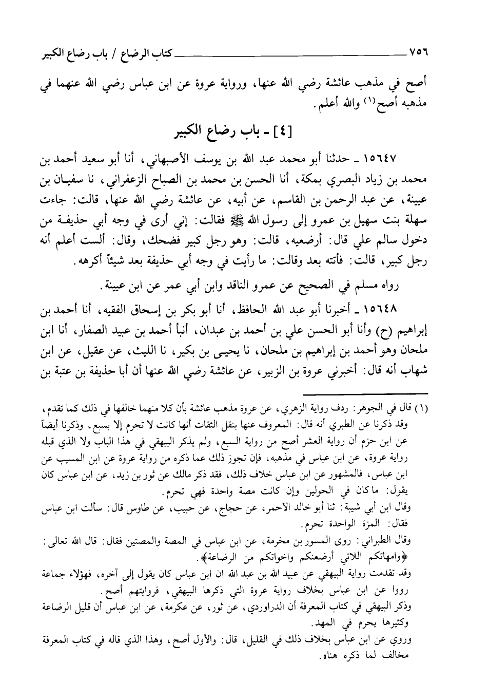 15647 - حَدَّثَنَا أَبُو مُحَمَّدٍ عَبْدُ اللهِ بْنُ يُوسُفَ الْأَصْبَهَانِيُّ، أنا أَبُو سَعِيدٍ أَحْمَدُ بْنُ مُحَمَّدِ بْنِ زِيَادٍ الْبَصْرِيُّ بِمَكَّةَ، أنا الْحَسَنُ بْنُ مُحَمَّدِ بْنِ الصَّبَّاحِ الزَّعْفَرَانِيُّ، نا سُفْيَانُ بْنُ عُيَيْنَةَ، عَنْ عَبْدِ الرَّحْمَنِ بْنِ الْقَاسِمِ، عَنْ أَبِيهِ، عَنْ عَائِشَةَ رَضِيَ اللهُ عَنْهَا قَالَتْ: جَاءَتْ سَهْلَةُ بِنْتُ سُهَيْلِ بْنِ عَمْرٍو إِلَى رَسُولِ اللهِ صَلَّى اللهُ عَلَيْهِ وَسَلَّمَ فَقَالَتْ: إِنِّي أَرَى فِي وَجْهِ أَبِي حُذَيْفَةَ مِنْ دُخُولِ سَالِمٍ عَلَيَّ قَالَ: " §أَرْضِعِيهِ " قَالَتْ: وَهُوَ رَجُلٌ كَبِيرٌ؟ فَضَحِكَ وَقَالَ: " أَلَسْتُ أَعْلَمُ أَنَّهُ رَجُلٌ كَبِيرٌ؟ " قَالَتْ: فَأَتَتْهُ بَعْدُ وَقَالَتْ: مَا رَأَيْتُ فِي وَجْهِ أَبِي حُذَيْفَةَ بَعْدُ شَيْئًا أَكْرَهُهُ رَوَاهُ مُسْلِمٌ فِي الصَّحِيحِ، عَنْ عَمْرٍو النَّاقِدِ وَابْنُ أَبِي عُمَرَ عَنِ ابْنِ عُيَيْنَةَ