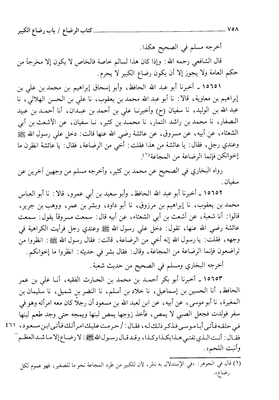 15651 - أَخْبَرَنَا أَبُو عَبْدِ اللهِ الْحَافِظُ، وَأَبُو إِسْحَاقَ إِبْرَاهِيمُ بْنُ مُحَمَّدِ بْنِ عَلِيِّ بْنِ إِبْرَاهِيمَ بْنِ مُعَاوِيَةَ قَالَا: نا أَبُو عَبْدِ اللهِ مُحَمَّدُ بْنُ يَعْقُوبَ، نا عَلِيُّ بْنُ الْحَسَنِ الْهِلَالِيُّ، نا عَبْدُ اللهِ بْنُ الْوَلِيدِ، نا سُفْيَانُ، ح وَأَخْبَرَنَا عَلِيُّ بْنُ أَحْمَدَ بْنِ عَبْدَانَ، أنا أَحْمَدُ بْنُ عُبَيْدٍ الصَّفَّارُ، نا مُحَمَّدُ بْنُ رَاشِدٍ التَّمَّارُ، نا مُحَمَّدُ بْنُ كَثِيرٍ، نا سُفْيَانُ، عَنِ الْأَشْعَثِ بْنِ أَبِي الشَّعْثَاءِ، عَنْ أَبِيهِ، عَنْ مَسْرُوقٍ، عَنْ عَائِشَةَ رَضِيَ اللهُ عَنْهَا قَالَتْ: دَخَلَ عَلَيَّ رَسُولُ اللهِ صَلَّى اللهُ عَلَيْهِ وَسَلَّمَ وَعِنْدِي رَجُلٌ فَقَالَ: " يَا عَائِشَةُ مَنْ هَذَا؟ " فَقُلْتُ: أَخِي مِنَ الرَّضَاعَةِ، فَقَالَ: " يَا عَائِشَةُ §انْظُرْنَ مَا إِخْوَانُكُنَّ فَإِنَّمَا الرَّضَاعَةُ مِنَ الْمَجَاعَةِ " رَوَاهُ الْبُخَارِيُّ فِي الصَّحِيحِ، عَنْ مُحَمَّدِ بْنِ كَثِيرٍ، وَأَخْرَجَهُ مُسْلِمٌ، مِنْ وَجْهَيْنِ آخَرَيْنِ عَنْ سُفْيَانَ
