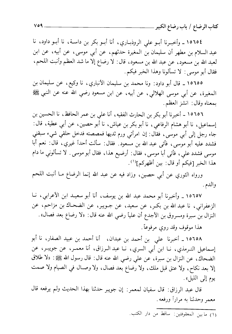 15654 - وَأَخْبَرَنَا أَبُو عَلِيٍّ الرُّوذْبَارِيُّ، أنا أَبُو بَكْرِ بْنُ دَاسَةَ، نا أَبُو دَاوُدَ، نا عَبْدُ السَّلَامِ بْنُ مُطَهَّرٍ أَنَّ سُلَيْمَانَ بْنَ الْمُغِيرَةِ حَدَّثَهُمْ، عَنْ أَبِي مُوسَى، عَنْ أَبِيهِ، عَنِ ابْنٍ لِعَبْدِ اللهِ بْنِ مَسْعُودٍ، عَنْ عَبْدِ اللهِ بْنِ مَسْعُودٍ قَالَ: §" لَا رَضَاعَ إِلَّا مَا شَدَّ الْعَظْمَ وَأَنْبَتَ اللَّحْمَ " فَقَالَ أَبُو مُوسَى لَا تَسْأَلُونَا وَهَذَا الْحَبْرُ فِيكُمْ