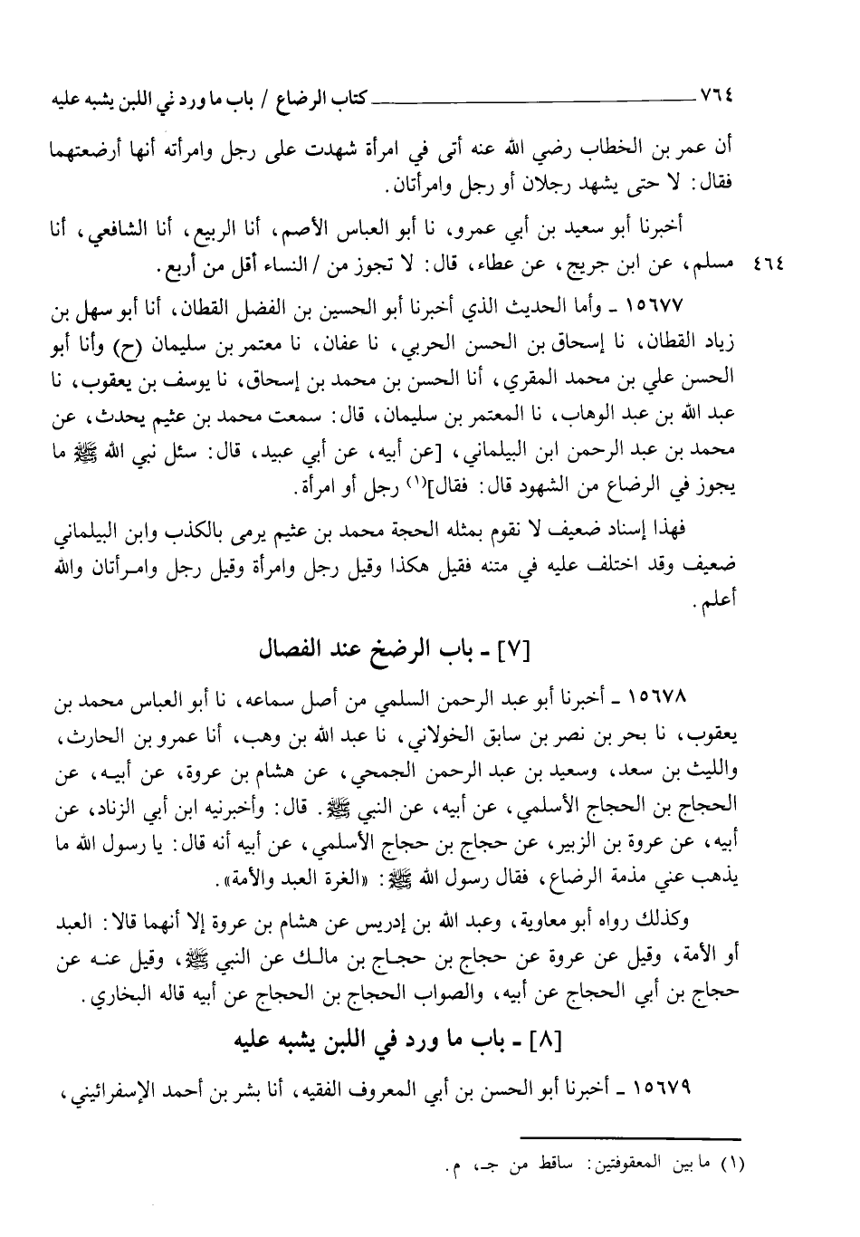 15677 - وَأَمَّا الْحَدِيثُ الَّذِي أَخْبَرَنَا أَبُو الْحُسَيْنِ بْنُ الْفَضْلِ الْقَطَّانُ، أنا أَبُو سَهْلِ بْنُ زِيَادٍ الْقَطَّانُ، نا إِسْحَاقُ بْنُ الْحَسَنِ الْحَرْبِيُّ، نا عَفَّانُ، نا مُعْتَمِرُ بْنُ سُلَيْمَانَ، ح وَأنا أَبُو الْحَسَنِ عَلِيُّ بْنُ مُحَمَّدٍ الْمُقْرِئُ، أنا الْحَسَنُ بْنُ مُحَمَّدِ بْنِ إِسْحَاقَ، نا يُوسُفُ بْنُ يَعْقُوبَ، نا عَبْدُ اللهِ بْنُ عَبْدِ الْوَهَّابِ، نا الْمُعْتَمِرُ بْنُ سُلَيْمَانَ قَالَ: سَمِعْتُ مُحَمَّدَ بْنَ عُثَيْمٍ، يُحَدِّثُ عَنْ مُحَمَّدِ بْنِ عَبْدِ الرَّحْمَنِ بْنِ الْبَيْلَمَانِيِّ، عَنْ أَبِيهِ، عَنْ أَبِي عُبَيْدٍ قَالَ: سُئِلَ نَبِيُّ اللهِ صَلَّى اللهُ عَلَيْهِ وَسَلَّمَ مَا يَجُوزُ فِي الرَّضَاعِ مِنَ الشُّهُودِ قَالَ: فَقَالَ §" رَجُلٌ أَوِ امْرَأَةٌ " فَهَذَا إِسْنَادٌ ضَعِيفٌ لَا تَقُومُ بِمِثْلِهِ الْحُجَّةُ مُحَمَّدُ بْنُ عُثَيْمٍ يُرْمَى بِالْكَذِبِ وَابْنُ الْبَيْلَمَانِيِّ ضَعِيفٌ وَقَدِ اخْتُلِفَ عَلَيْهِ فِي مَتْنِهِ فَقِيلَ هَكَذَا وَقِيلَ رَجُلٌ وَامْرَأَةٌ وَقِيلَ رَجُلٌ وَامْرَأَتَانِ , وَاللهُ أَعْلَمُ