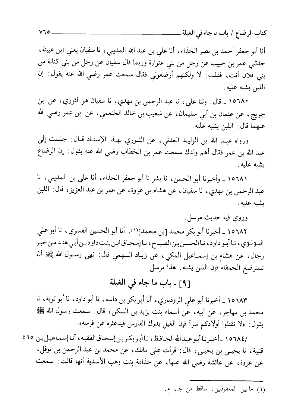 15681 - وَأَخْبَرَنَا أَبُو الْحَسَنِ، نا بِشْرٌ، نا أَبُو جَعْفَرٍ الْحَذَّاءُ، أنا عَلِيُّ بْنُ الْمَدِينِيِّ، نا عَبْدُ الرَّحْمَنِ بْنُ مَهْدِيٍّ، نا سُفْيَانُ، عَنْ هِشَامِ بْنِ عُرْوَةَ، عَنْ عُمَرَ بْنِ عَبْدِ الْعَزِيزِ قَالَ: §" اللَّبَنُ يُشْبِهُ عَلَيْهِ " وَرُوِيَ فِيهِ حَدِيثٌ مُرْسَلٌ
