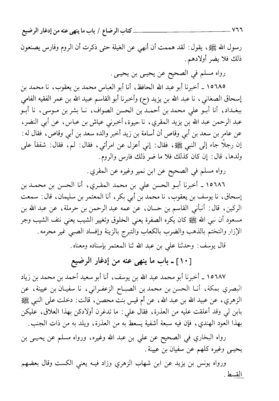 15685 - أَخْبَرَنَا أَبُو عَبْدِ اللهِ الْحَافِظُ، أنا أَبُو الْعَبَّاسِ مُحَمَّدُ بْنُ يَعْقُوبَ، نا مُحَمَّدُ بْنُ إِسْحَاقَ الصَّغَانِيُّ، نا عَبْدُ اللهِ بْنُ يَزِيدَ، ح وَأَخْبَرَنَا أَبُو الْقَاسِمِ عُبَيْدُ اللهِ بْنُ عُمَرَ الْفَقِيهُ الْفَامِيُّ بِبَغْدَادَ، أنا أَبُو عَلِيٍّ مُحَمَّدُ بْنُ أَحْمَدَ بْنِ الْحَسَنِ الصَّوَّافُ، نا بِشْرُ بْنُ مُوسَى، نا أَبُو عَبْدِ الرَّحْمَنِ عَبْدُ اللهِ بْنُ يَزِيدَ الْمُقْرِئُ، نا حَيْوَةُ، أَخْبَرَنِي عَيَّاشُ بْنُ عَبَّاسٍ، عَنْ أَبِي النَّضْرِ، عَنْ عَامِرِ بْنِ سَعْدِ بْنِ أَبِي وَقَّاصٍ أَنَّ أُسَامَةَ بْنَ زَيْدٍ أَخْبَرَ وَالِدَهُ سَعْدَ بْنَ أَبِي وَقَّاصٍ فَقَالَ لَهُ: إِنَّ رَجُلًا جَاءَ إِلَى النَّبِيِّ صَلَّى اللهُ عَلَيْهِ وَسَلَّمَ فَقَالَ: إِنِّي أَعْزِلُ عَنِ امْرَأَتِي فَقَالَ: لِمَ؟ فَقَالَ: §شَفَقًا عَلَى وَلَدِهَا قَالَ: " إِنْ كَانَ كَذَلِكَ فَلَا مَا ضَرَّ ذَلِكَ فَارِسَ وَالرُّومَ " رَوَاهُ مُسْلِمٌ فِي الصَّحِيحِ عَنِ ابْنِ نُمَيْرٍ وَغَيْرِهِ عَنِ الْمُقْرِئِ