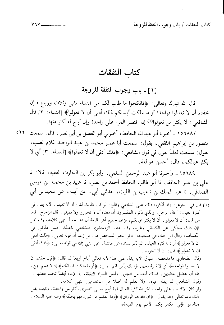 15688 - أَخْبَرَنَا أَبُو عَبْدِ اللهِ الْحَافِظُ، أَخْبَرَنِي أَبُو الْفَضْلِ بْنُ أَبِي نَصْرٍ قَالَ: سَمِعْتُ مَنْصُورَ بْنَ إِبْرَاهِيمَ الثَّقَفِيَّ يَقُولُ: سَمِعْتُ أَبَا عُمَرَ مُحَمَّدَ بْنَ عَبْدِ الْوَاحِدِ غُلَامَ ثَعْلَبٍ يَقُولُ: سَمِعْتُ ثَعْلَبًا، يَقُولُ فِي قَوْلِ الشَّافِعِيِّ: {ذَلِكَ أَدْنَى أَلَّا تَعُولُوا} [النساء: 3] " أَيْ لَا يَكْثُرُ عِيَالُكُمْ " قَالَ: " أَحْسَنُ هُوَ لُغَةً "