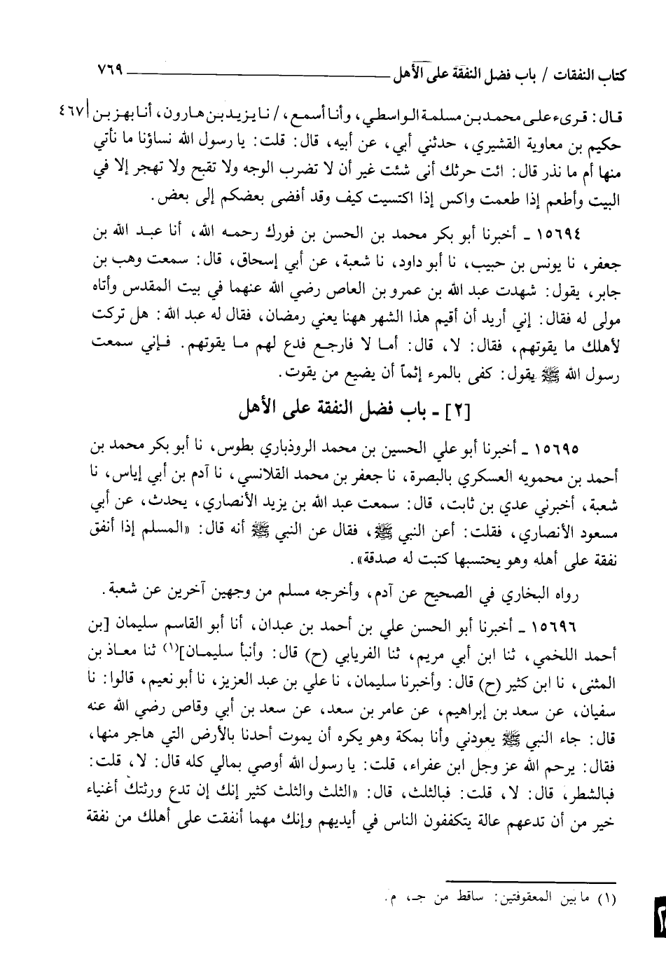 15696 - أَخْبَرَنَا أَبُو الْحَسَنِ عَلِيُّ بْنُ أَحْمَدَ بْنِ عَبْدَانَ، أنا أَبُو الْقَاسِمِ سُلَيْمَانُ بْنُ أَحْمَدَ اللَّخْمِيُّ، ثنا ابْنُ أَبِي مَرْيَمَ، ثنا الْفِرْيَابِيُّ، ح قَالَ: وَأنبأ سُلَيْمَانُ، ثنا مُعَاذُ بْنُ الْمُثَنَّى، نا ابْنُ كَثِيرٍ، ح قَالَ: وَأَخْبَرَنَا سُلَيْمَانُ، نا عَلِيُّ بْنُ عَبْدِ الْعَزِيزِ، نا أَبُو نُعَيْمٍ قَالُوا: نا سُفْيَانُ، عَنْ سَعْدِ بْنِ إِبْرَاهِيمَ، عَنْ عَامِرِ بْنِ سَعْدٍ، عَنْ سَعْدِ بْنِ أَبِي وَقَّاصٍ رَضِيَ اللهُ عَنْهُ قَالَ: جَاءَ النَّبِيُّ صَلَّى اللهُ عَلَيْهِ وَسَلَّمَ يَعُودُنِي وَأَنَا بِمَكَّةَ وَهُوَ يَكْرَهُ أَنْ يَمُوتَ أَحَدُنَا بِالْأَرْضِ الَّتِي هَاجَرَ مِنْهَا فَقَالَ: " يَرْحَمُ اللهُ عَزَّ وَجَلَّ ابْنَ عَفْرَاءَ " قُلْتُ: يَا رَسُولَ اللهِ أُوصِي بِمَالِي كُلِّهِ قَالَ: " لَا " قُلْتُ: فَبِالشَّطْرِ قَالَ: " لَا " قُلْتُ: فَبِالثُّلُثِ قَالَ: §" الثُّلُثُ وَالثُّلُثُ كَثِيرٌ إِنَّكَ إِنْ تَدَعْ وَرَثَتَكَ أَغْنِيَاءَ خَيْرٌ مِنْ أَنْ تَدَعَهُمْ عَالَةً يَتَكَفَّفُونَ النَّاسَ فِي أَيْدِيهِمْ وَإِنَّكَ مَهْمَا أَنْفَقْتَ عَلَى أَهْلِكَ مِنْ نَفَقَةٍ -[769]- فَإِنَّهَا صَدَقَةٌ حَتَّى اللُّقْمَةَ تَرْفَعُهَا إِلَى فِي امْرَأَتِكَ وَعَسَى الله عَزَّ وَجَلَّ أَنْ يَنْفَعَ بِكَ قَوْمًا وَيَضُرَّ بِكَ آخَرِينَ " وَلَمْ يَكُنْ لَهُ يَوْمَئِذٍ إِلَّا ابْنَةٌ رَوَاهُ الْبُخَارِيُّ فِي الصَّحِيحِ، عَنْ أَبِي نُعَيْمٍ وَمُحَمَّدِ بْنِ كَثِيرٍ وَأَخْرَجَهُ مُسْلِمٌ مِنْ وَجْهٍ آخَرَ عَنْ سُفْيَانَ الثَّوْرِيِّ