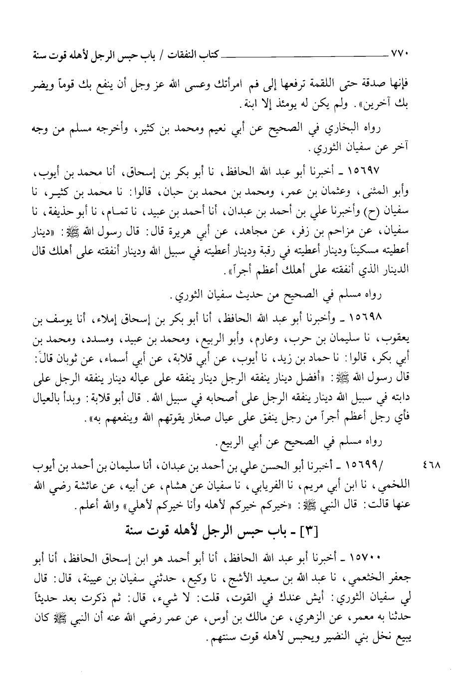 15697 - أَخْبَرَنَا أَبُو عَبْدِ اللهِ الْحَافِظُ، نا أَبُو بَكْرِ بْنُ إِسْحَاقَ، أنا مُحَمَّدُ بْنُ أَيُّوبَ، وَأَبُو الْمُثَنَّى، وَعُثْمَانُ بْنُ عُمَرَ، وَمُحَمَّدُ بْنُ مُحَمَّدِ بْنِ حَبَّانَ، قَالُوا: نا مُحَمَّدُ بْنُ كَثِيرٍ، نا سُفْيَانُ، ح وَأَخْبَرَنَا عَلِيُّ بْنُ أَحْمَدَ بْنِ عَبْدَانَ، أنا أَحْمَدُ بْنُ عُبَيْدٍ، نا تَمَامٌ، نا أَبُو حُذَيْفَةَ، نا سُفْيَانُ، عَنْ مُزَاحِمِ بْنِ زُفَرَ، عَنْ مُجَاهِدٍ، عَنْ أَبِي هُرَيْرَةَ قَالَ: قَالَ رَسُولُ اللهِ صلَّى الله عَلَيْهِ وَسَلَّمَ: §" دِينَارٌ أَعْطَيْتَهُ مِسْكِينًا وَدِينَارٌ أَعْطَيْتَهُ فِي رَقَبَةٍ وَدِينَارٌ أَعْطَيْتَهُ فِي سَبِيلِ اللهِ وَدِينَارٌ أَنْفَقْتَهُ عَلَى أَهْلِكَ قَالَ: الدِّينَارُ الَّذِي أَنْفَقْتَهُ عَلَى أَهْلِكَ أَعْظَمُ أَجْرًا " رَوَاهُ مُسْلِمٌ فِي الصَّحِيحِ مِنْ حَدِيثِ سُفْيَانَ الثَّوْرِيِّ