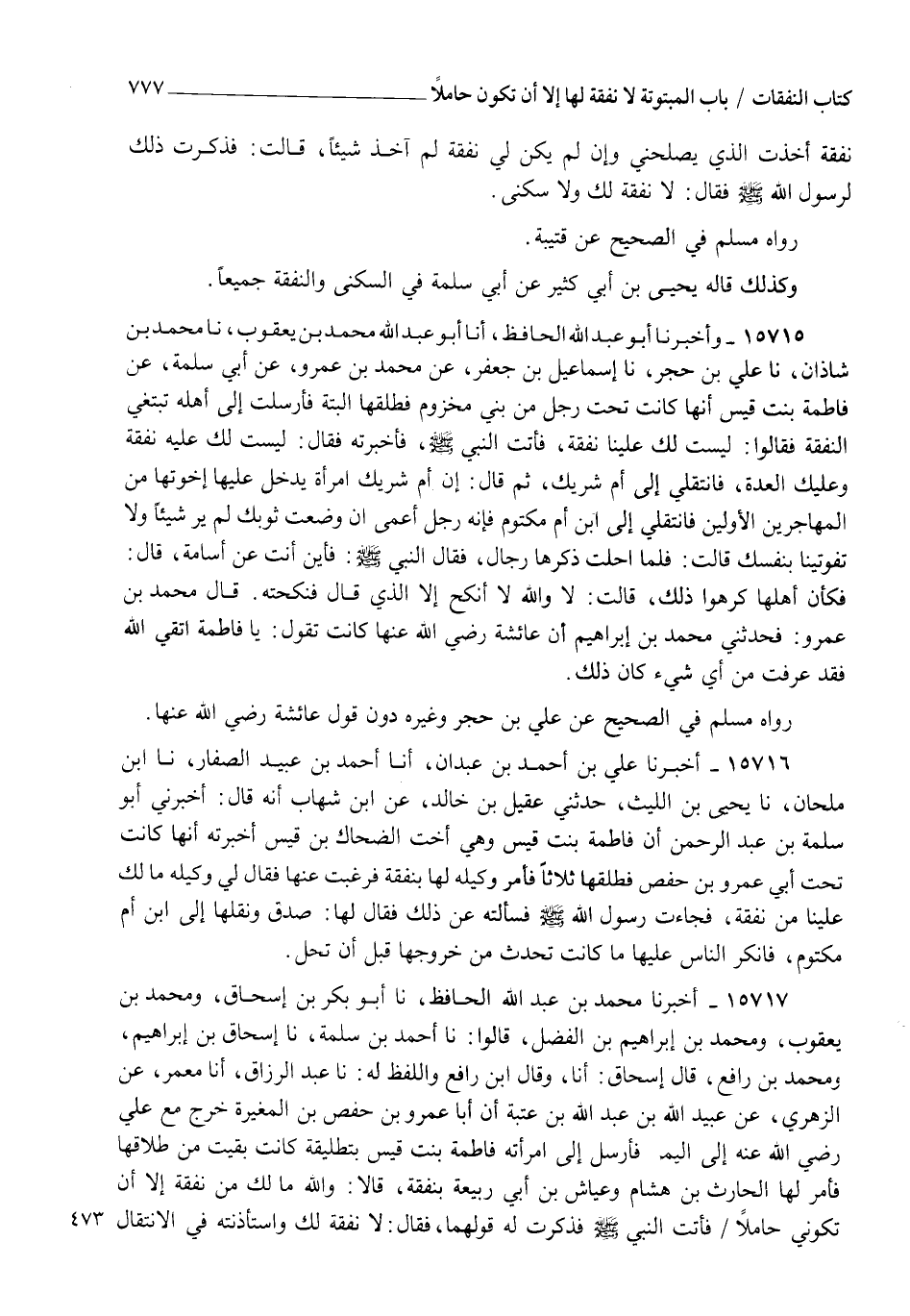15715 - وَأَخْبَرَنَا أَبُو عَبْدِ اللهِ الْحَافِظُ، أنا أَبُو عَبْدِ اللهِ مُحَمَّدُ بْنُ يَعْقُوبَ، نا مُحَمَّدُ بْنُ شَاذَانَ، نا عَلِيُّ بْنُ حُجْرٍ، نا إِسْمَاعِيلُ بْنُ جَعْفَرٍ، عَنْ مُحَمَّدِ بْنِ عَمْرٍو، عَنْ أَبِي سَلَمَةَ، عَنْ فَاطِمَةَ بِنْتِ قَيْسٍ أَنَّهَا كَانَتْ تَحْتَ رَجُلٍ مِنْ بَنِي مَخْزُومٍ فَطَلَّقَهَا الْبَتَّةَ فَأَرْسَلَتْ إِلَى أَهْلِهِ تَبْتَغِي النَّفَقَةَ فَقَالُوا: لَيْسَتْ لَكِ عَلَيْنَا نَفَقَةٌ فَأَتَتِ النَّبِيَّ صَلَّى اللهُ عَلَيْهِ وَسَلَّمَ فَأَخْبَرَتْهُ فَقَالَ: " §لَيْسَتْ لَكِ عَلَيْهِ نَفَقَةٌ، وَعَلَيْكِ الْعِدَّةُ فَانْتَقِلِي إِلَى أُمِّ شَرِيكٍ "، ثُمَّ قَالَ: " إِنَّ أُمَّ شَرِيكٍ امْرَأَةٌ يَدْخُلُ عَلَيْهَا إِخْوَتُهَا مِنَ الْمُهَاجِرِينِ الْأَوَّلِينَ فَانْتَقِلِي إِلَى ابْنِ أُمِّ مَكْتُومٍ فَإِنَّهُ رَجُلٌ أَعْمَى إِنْ وَضَعْتِ ثَوْبَكِ لَمْ يَرَ شَيْئًا وَلَا تُفَوِّتِينَا بِنَفْسِكَ " قَالَتْ: فَلَمَّا أَحَلَّتْ ذَكَرَهَا رِجَالٌ فَقَالَ النَّبِيُّ صَلَّى اللهُ عَلَيْهِ وَسَلَّمَ: " فَأَيْنَ أَنْتِ عَنْ أُسَامَةَ؟ " قَالَ: فَكَأَنَّ أَهْلَهَا كَرِهُوا ذَلِكَ قَالَتْ: لَا وَاللهِ لَا أَنْكِحُ إِلَّا الَّذِي قَالَ فَنَكَحَتْهُ قَالَ مُحَمَّدُ بْنُ عَمْرٍو فَحَدَّثَنِي مُحَمَّدُ بْنُ إِبْرَاهِيمَ أَنَّ عَائِشَةَ رَضِيَ اللهُ عَنْهَا كَانَتْ تَقُولُ: يَا فَاطِمَةُ اتَّقِي اللهَ فَقَدْ عَرَفْتُ مِنْ أِيِّ شَيْءٍ كَانَ ذَلِكَ , رَوَاهُ مُسْلِمٌ فِي الصَّحِيحِ، عَنْ عَلِيِّ بْنِ حُجْرٍ وَغَيْرِهِ دُونَ قَوْلِ عَائِشَةَ رَضِيَ اللهُ عَنْهَا