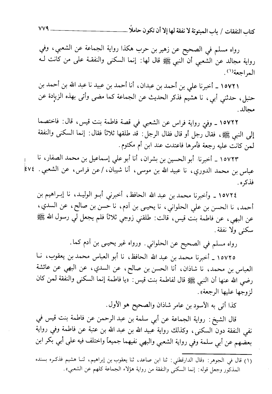 15725 - أَخْبَرَنَا مُحَمَّدُ بْنُ عَبْدِ اللهِ الْحَافِظُ، نا أَبُو الْعَبَّاسِ مُحَمَّدُ بْنُ يَعْقُوبَ، نا الْعَبَّاسُ بْنُ مُحَمَّدٍ، نا شَاذَانُ، أنا الْحَسَنُ بْنُ صَالِحٍ، عَنِ السُّدِّيِّ، عَنِ الْبَهِيِّ، عَنْ عَائِشَةَ رَضِيَ اللهُ عَنْهَا أَنَّ النَّبِيَّ صَلَّى اللهُ عَلَيْهِ وَسَلَّمَ قَالَ لِفَاطِمَةَ بِنْتِ قَيْسٍ: " يَا فَاطِمَةُ إِنَّمَا §السُّكْنَى وَالنَّفَقَةُ لِمَنْ كَانَ لِزَوْجِهَا عَلَيْهَا الرَّجْعَةُ " كَذَا أَتَى بِهِ الْأَسْوَدُ بْنُ عَامِرٍ شَاذَانُ وَالصَّحِيحُ هُوَ الْأَوَّلُ قَالَ الشَّيْخُ: رِوَايَةُ الْجَمَاعَةِ عَنْ أَبِي سَلَمَةَ بْنِ عَبْدِ الرَّحْمَنِ عَنْ فَاطِمَةَ بِنْتِ قَيْسٍ فِي نَفْيِ النَّفَقَةِ دُونَ السُّكْنَى , وَكَذَلِكَ رِوَايَةُ عُبَيْدِ اللهِ بْنِ عَبْدِ اللهِ بْنِ عُتْبَةَ عَنْ فَاطِمَةَ، وَفِي رِوَايَةِ بَعْضِهِمْ عَنْ أَبِي سَلَمَةَ، وَفِي رِوَايَةِ الشَّعْبِيِّ وَالْبَهِيِّ نَفْيُهُمَا جَمِيعًا وَاخْتُلِفَ فِيهِ عَلَى أَبِي بَكْرِ بْنِ -[779]- أَبِي الْجَهْمِ عَنْ فَاطِمَةَ , وَالْأَشْبَهُ بِسِيَاقِ الْحَدِيثِ أَنَّ النَّبِيَّ صَلَّى اللهُ عَلَيْهِ وَسَلَّمَ نَفَى النَّفَقَةَ وَأَذِنَ لَهَا فِي الِانْتِقَالِ لِعِلَّةٍ لَعَلَّهَا اسْتَحَيَتْ مِنْ ذِكْرِهَا وَقَدْ ذَكَرَهَا غَيْرُهَا عَلَى مَا قَدَّمْنَا ذِكْرَهَا فِي كِتَابِ الْعِدَدِ وَلَمْ يَرِدْ نَفْيُ السُّكْنَى أَصْلًا , أَلَا تَرَاهُ صَلَّى اللهُ عَلَيْهِ وَسَلَّمَ لَمْ يَقُلْ لَهَا: اعْتَدِّي حَيْثُ شِئْتِ وَلَكِنَّهُ حَصَنَهَا حَيْثُ رَضِيَ إِذْ كَانَ زَوْجُهَا غَائِبًا وَلَمْ يَكُنْ لَهُ وَكِيلٌ يُحْصِنُهَا , وَأَمَّا قَوْلُهُ: " إِنَّمَا السُّكْنَى وَالنَّفَقَةُ لِمَنْ كَانَتْ عَلَيْهِ رَجْعَةٌ " فَلَيْسَ بِمَعْرُوفٍ فِي هَذَا الْحَدِيثِ وَلَمْ يَرِدْ مِنْ وَجْهٍ يُثْبِتُ مِثْلَهُ , وَأَمَّا إِنْكَارُ مَنْ أَنْكَرَ عَلَى فَاطِمَةَ فَإِنَّمَا هُوَ لِكِتْمَانِهَا السَّبَبَ فِي نَقْلِهَا
