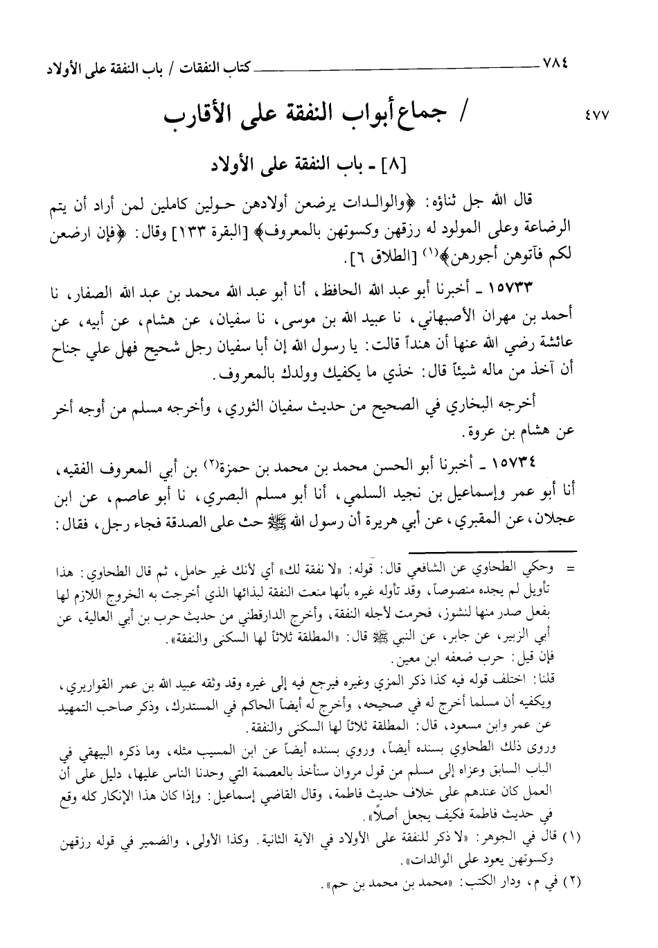 15733 - أَخْبَرَنَا أَبُو عَبْدِ اللهِ الْحَافِظُ، أنا أَبُو عَبْدِ اللهِ مُحَمَّدُ بْنُ عَبْدِ اللهِ الصَّفَّارُ، نا أَحْمَدُ بْنُ مِهْرَانَ الْأَصْبَهَانِيُّ، نا عُبَيْدُ اللهِ بْنُ مُوسَى، نا سُفْيَانُ، عَنْ هِشَامٍ، عَنْ أَبِيهِ، عَنْ عَائِشَةَ رَضِيَ اللهُ عَنْهَا أَنَّ هِنْدًا قَالَتْ: يَا رَسُولَ اللهِ إِنَّ أَبَا سُفْيَانَ رَجُلٌ شَحِيحٌ فَهَلْ عَلَيَّ جُنَاحٌ أَنْ آخُذَ مِنْ مَالِهِ شَيْئًا؟ قَالَ: §" خُذِي مَا يَكْفِيكِ وَوَلَدَكِ بِالْمَعْرُوفِ " أَخْرَجَهُ الْبُخَارِيُّ فِي الصَّحِيحِ مِنْ حَدِيثِ سُفْيَانَ الثَّوْرِيِّ، وَأَخْرَجَهُ مُسْلِمٌ مِنْ أَوْجُهٍ أُخَرَ، عَنْ هِشَامِ بْنِ عُرْوَةَ