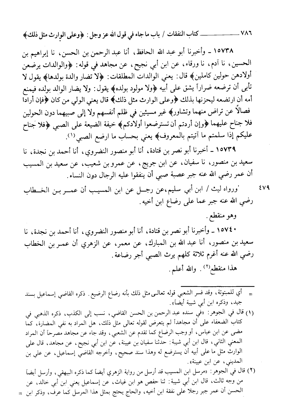15740 - وَأَخْبَرَنَا أَبُو نَصْرِ بْنُ قَتَادَةَ، أنا أَبُو مَنْصُورٍ النَّضْرَوِيُّ، أنا أَحْمَدُ بْنُ نَجْدَةَ، نا سَعِيدُ بْنُ مَنْصُورٍ، أنا عَبْدُ اللهِ بْنُ الْمُبَارَكِ، عَنْ مَعْمَرٍ، عَنِ الزُّهْرِيِّ، أَنَّ عُمَرَ بْنَ الْخَطَّابِ رَضِيَ اللهُ عَنْهُ §" أَغْرَمَ ثَلَاثَةً كُلُّهُمْ يَرِثُ الصَّبِيَّ أَجْرَ رَضَاعَةٍ " هَذَا مُنْقَطِعٌ وَاللهُ أَعْلَمُ