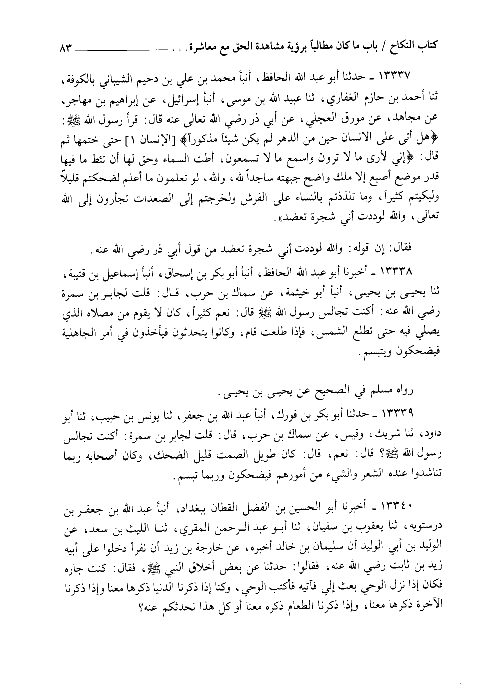 13338 - أَخْبَرَنَا أَبُو عَبْدِ اللهِ الْحَافِظُ، أنبأ أَبُو بَكْرِ بْنُ إِسْحَاقَ، أنبأ إِسْمَاعِيلُ بْنُ قُتَيْبَةَ، ثنا يَحْيَى بْنُ يَحْيَى، أنبأ أَبُو خَيْثَمَةَ، عَنْ سِمَاكِ بْنِ حَرْبٍ قَالَ: قُلْتُ لِجَابِرِ بْنِ سَمُرَةَ رَضِيَ اللهُ عَنْهُ: أَكُنْتَ تُجَالِسُ رَسُولَ اللهِ صَلَّى اللهُ عَلَيْهِ وَسَلَّمَ؟ قَالَ: نَعَمْ كَثِيرًا كَانَ §لَا يَقُومُ مِنْ مُصَلَّاهُ الَّذِي يُصَلِّي فِيهِ حَتَّى تَطْلُعَ الشَّمْسُ، فَإِذَا طَلَعَتْ قَامَ، وَكَانُوا يَتَحَدَّثُونَ، فَيَأْخُذُونَ فِي أَمْرِ الْجَاهِلِيَّةِ، فَيَضْحَكُونَ وَيَتَبَسَّمُ " رَوَاهُ مُسْلِمٌ فِي الصَّحِيحِ عَنْ يَحْيَى بْنِ يَحْيَى