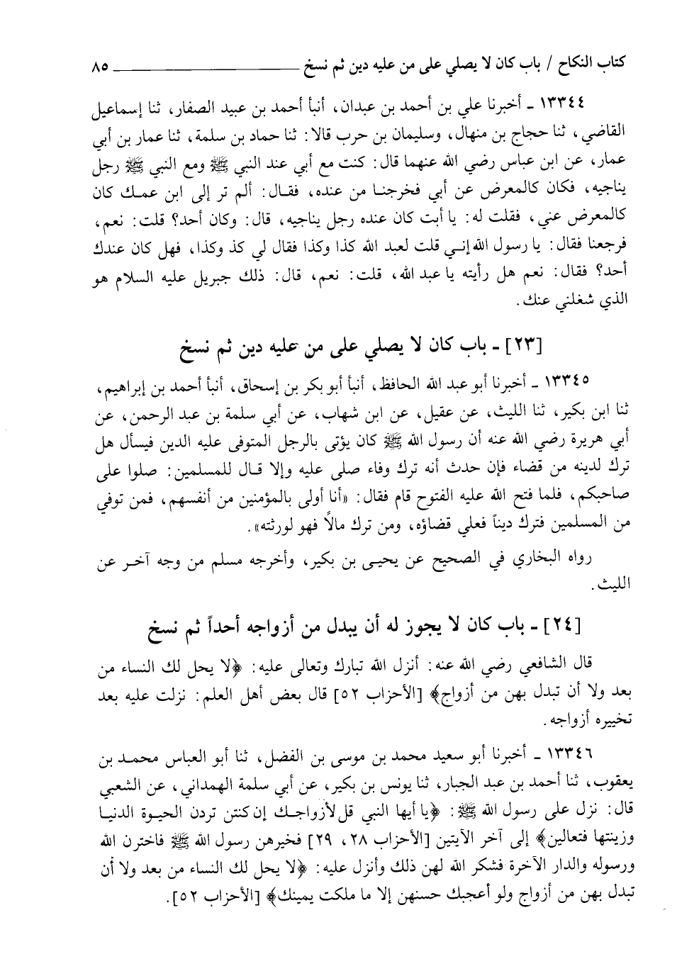 13346 - أَخْبَرَنَا أَبُو سَعِيدٍ مُحَمَّدُ بْنُ مُوسَى بْنِ الْفَضْلِ، ثنا أَبُو الْعَبَّاسِ مُحَمَّدُ بْنُ يَعْقُوبَ، ثنا أَحْمَدُ بْنُ عَبْدِ الْجَبَّارِ، ثنا يُونُسُ بْنُ بُكَيْرٍ، عَنْ أَبِي سَلَمَةَ الْهَمْدَانِيِّ، عَنِ الشَّعْبِيِّ قَالَ: نَزَلَ عَلَى رَسُولِ اللهِ صَلَّى اللهُ عَلَيْهِ وَسَلَّمَ: {§يَا أَيُّهَا النَّبِيُّ قُلْ لِأَزْوَاجِكَ إِنْ كُنْتُنَّ تُرِدْنَ الْحَيَاةَ الدُّنْيَا وَزِينَتَهَا فَتَعَالَيْنَ} [الأحزاب: 28] إِلَى آخِرِ الْآيَتَيْنِ، فَخَيَّرَهُنَّ رَسُولُ اللهِ صَلَّى اللهُ عَلَيْهِ وَسَلَّمَ، فَاخْتَرْنَ اللهَ وَرَسُولَهُ وَالدَّارَ الْآخِرَةَ، فَشَكَرَ اللهُ لَهُنَّ ذَلِكَ وَأَنْزَلَ عَلَيْهِ {لَا يَحِلُّ لَكَ النِّسَاءُ مِنْ بَعْدُ، وَلَا أَنْ تَبَدَّلَ بِهِنَّ مِنْ أَزْوَاجٍ، وَلَوْ أَعْجَبَكَ حُسْنُهُنَّ، إِلَّا مَا مَلَكَتْ يَمِينُكَ} [الأحزاب: 52]