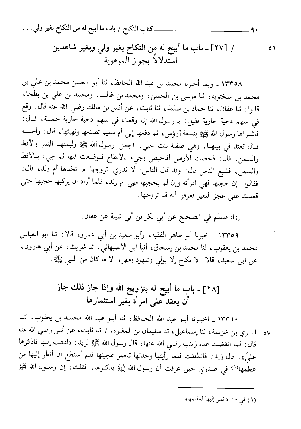 13358 - وَبِمَا أَخْبَرَنَا مُحَمَّدُ بْنُ عَبْدِ اللهِ الْحَافِظُ، ثنا أَبُو الْحَسَنِ مُحَمَّدُ بْنُ عَلِيِّ بْنِ مُحَمَّدِ بْنِ سَخْتَوَيْهِ، ثنا مُوسَى بْنُ الْحَسَنِ، وَمُحَمَّدُ بْنُ غَالِبٍ، وَمُحَمَّدُ بْنُ عَلِيِّ بْنِ بُطْحَا، قَالُوا: ثنا عَفَّانُ، ثنا حَمَّادُ بْنُ سَلَمَةَ، ثنا ثَابِتٌ، عَنْ أَنَسِ بْنِ مَالِكٍ رَضِيَ اللهُ عَنْهُ قَالَ: وَقَعَ فِي سَهْمِ دِحْيَةَ جَارِيَةٌ، فَقِيلَ: يَا رَسُولَ اللهِ إِنَّهُ وَقَعَتْ فِي سَهْمِ دِحْيَةَ جَارِيَةٌ جَمِيلَةٌ قَالَ: فَاشْتَرَاهَا رَسُولُ اللهِ صَلَّى اللهُ عَلَيْهِ وَسَلَّمَ بِتِسْعَةِ أَرْؤُسٍ، ثُمَّ دَفَعَهَا إِلَى أُمِّ سُلَيْمٍ تَصْنَعُهَا وَتُهَيِّئُهَا قَالَ: وَأَحْسَبُهُ قَالَ: تَعْتَدُّ فِي بَيْتِهَا وَهِيَ صَفِيَّةُ بِنْتُ حُيَيٍّ، §فَجَعَلَ رَسُولُ اللهِ صَلَّى اللهُ عَلَيْهِ وَسَلَّمَ وَلِيمَتَهَا التَّمْرَ وَالْأَقِطَ وَالسَّمْنَ قَالَ: فُحِصَتِ الْأَرْضُ أَفَاحِيصَ وَجِيءَ بِالْأَنْطَاعِ، فَوُضِعَتْ فِيهَا، ثُمَّ جِيءَ بِالْأَقِطِ وَالسَّمْنِ، فَشَبِعَ النَّاسُ قَالَ: وَقَدْ قَالَ النَّاسُ: لَا نَدْرِي أَتَزَوَّجَهَا أَمِ اتَّخَذَهَا أُمَّ وَلَدٍ قَالَ: فَقَالُوا: إِنْ حَجَبَهَا فَهِيَ امْرَأَتُهُ، وَإِنْ لَمْ يَحْجُبْهَا، فَهِيَ أُمُّ وَلَدٍ، فَلَمَّا أَرَادَ أَنْ يُرْكِبَهَا حَجَبَهَا حَتَّى قَعَدَتْ عَلَى عَجُزِ الْبَعِيرِ فَعَرَفُوا أَنَّهُ قَدْ تَزَوَّجَهَا " رَوَاهُ مُسْلِمٌ فِي الصَّحِيحِ، عَنْ أَبِي بَكْرِ بْنِ أَبِي شَيْبَةَ عَنْ عَفَّانَ
