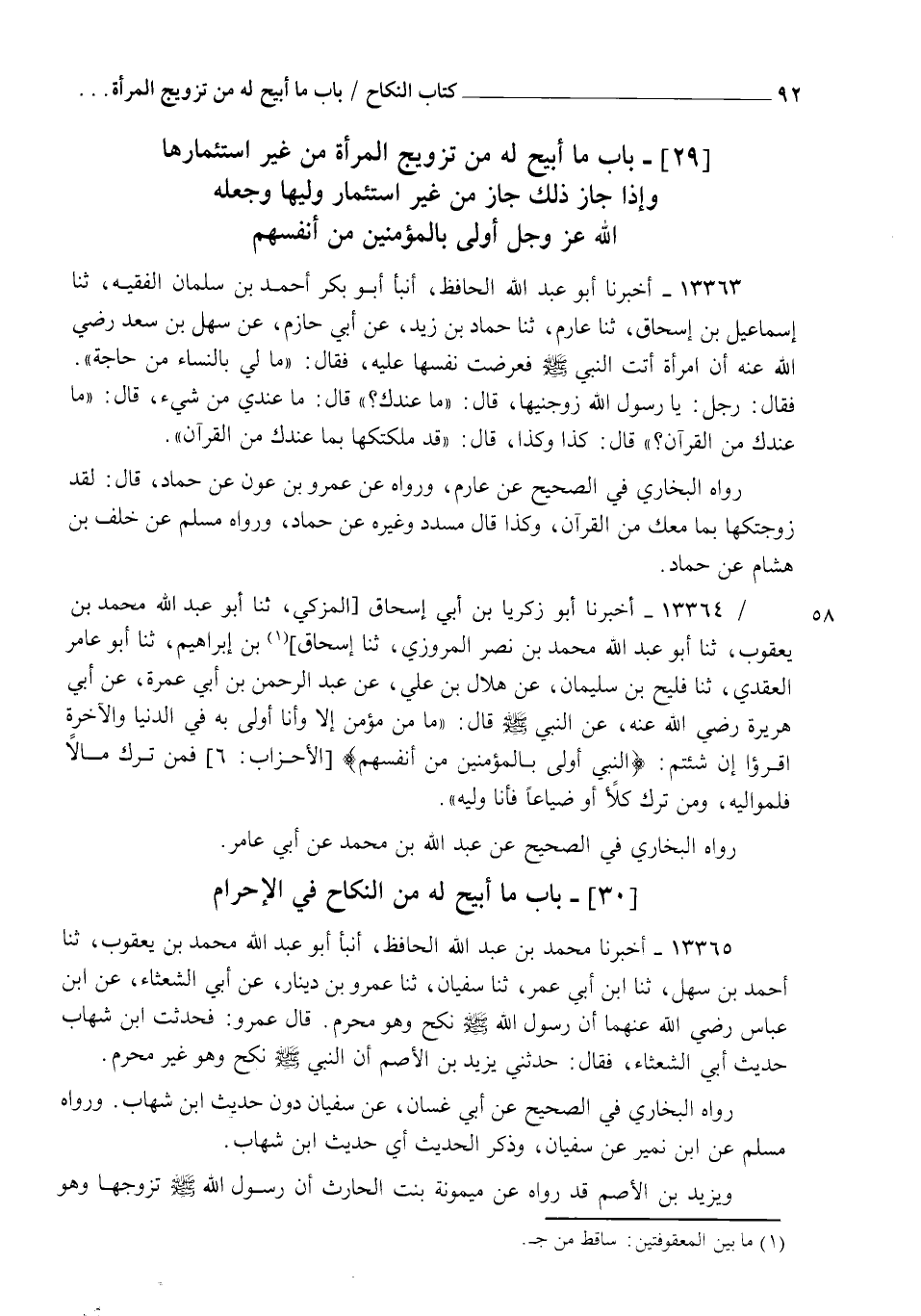 13365 - أَخْبَرَنَا مُحَمَّدُ بْنُ عَبْدِ اللهِ الْحَافِظُ، أنبأ أَبُو عَبْدِ اللهِ مُحَمَّدُ بْنُ يَعْقُوبَ، ثنا أَحْمَدُ بْنُ سَهْلٍ، ثنا ابْنُ أَبِي عُمَرَ، ثنا سُفْيَانُ، ثنا عَمْرُو بْنُ دِينَارٍ، عَنْ أَبِي الشَّعْثَاءِ، عَنِ ابْنِ عَبَّاسٍ رَضِيَ اللهُ عَنْهُمَا أَنَّ رَسُولَ اللهِ صَلَّى اللهُ عَلَيْهِ وَسَلَّمَ §نَكَحَ وَهُوَ مُحْرِمٌ قَالَ عَمْرٌو: فَحَدَّثْتُ ابْنَ شِهَابٍ حَدِيثَ أَبِي الشَّعْثَاءِ، فَقَالَ: حَدَّثَنِي يَزِيدُ بْنُ الْأَصَمِّ أَنَّ النَّبِيَّ صَلَّى اللهُ عَلَيْهِ وَسَلَّمَ نَكَحَ، وَهُوَ غَيْرُ مُحْرِمٍ " رَوَاهُ الْبُخَارِيُّ فِي الصَّحِيحِ، عَنْ أَبِي غَسَّانَ، عَنْ سُفْيَانَ دُونَ حَدِيثِ ابْنِ شِهَابٍ، وَرَوَاهُ مُسْلِمٌ، عَنِ ابْنِ نُمَيْرٍ عَنْ سُفْيَانَ، وَذَكَرَ الْحَدِيثَ أَيْ حَدِيثَ ابْنِ شِهَابٍ. وَيَزِيدُ بْنُ الْأَصَمِّ، قَدْ رَوَاهُ عَنْ مَيْمُونَةَ بِنْتِ الْحَارِثِ أَنَّ رَسُولَ اللهِ صَلَّى اللهُ عَلَيْهِ وَسَلَّمَ تَزَوَّجَهَا وَهُوَ -[93]- حَلَالٌ، فَالرِّوَايَةُ مُخْتَلِفَةٌ فِي نِكَاحِهِ صَلَّى اللهُ عَلَيْهِ وَسَلَّمَ وَهُوَ مُحْرِمٌ، فَإِنْ صَحَّ أَنَّهُ نَكَحَ وَهُوَ مُحْرِمٌ، وَقَدْ قَالَ: لَا يَنْكِحُ الْمُحْرِمُ وَلَا يُنْكِحُ فَحِينَئِذٍ يُتَصَوَّرُ التَّخْصِيصُ