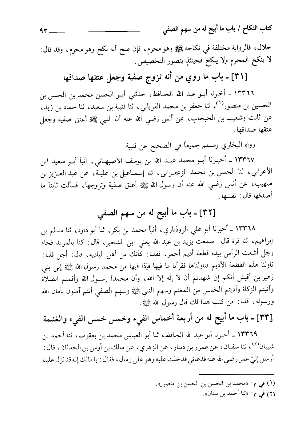 13366 - أَخْبَرَنَا أَبُو عَبْدِ اللهِ الْحَافِظُ، حَدَّثَنِي أَبُو الْحَسَنِ مُحَمَّدُ بْنُ الْحَسَنِ بْنِ الْحُسَيْنِ بْنِ مَنْصُورٍ، ثنا جَعْفَرُ بْنُ مُحَمَّدٍ الْفِرْيَابِيُّ، ثنا قُتَيْبَةُ بْنُ سَعِيدٍ، ثنا حَمَّادُ بْنُ زَيْدٍ، عَنْ ثَابِتٍ، وَشُعَيْبُ بْنُ الْحَبْحَابِ، عَنْ أَنَسٍ رَضِيَ اللهُ عَنْهُ أَنَّ النَّبِيَّ صَلَّى اللهُ عَلَيْهِ وَسَلَّمَ " §أَعْتَقَ صَفِيَّةَ، وَجَعَلَ عِتْقَهَا صَدَاقَهَا " رَوَاهُ الْبُخَارِيُّ، وَمُسْلِمٌ جَمِيعًا فِي الصَّحِيحِ، عَنْ قُتَيْبَةَ