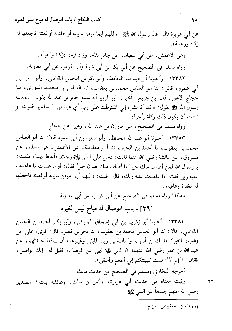 13384 - أَخْبَرَنَا أَبُو زَكَرِيَّا بْنُ أَبِي إِسْحَاقَ الْمُزَكِّي، وَأَبُو بَكْرٍ أَحْمَدُ بْنُ الْحَسَنِ الْقَاضِي قَالَا: ثنا أَبُو الْعَبَّاسِ مُحَمَّدُ بْنُ يَعْقُوبَ، ثنا بَحْرُ بْنُ نَصْرٍ قَالَ: قُرِئَ عَلَى ابْنِ وَهْبٍ، أَخْبَرَكَ مَالِكُ بْنُ أَنَسٍ، وَأُسَامَةُ بْنُ زَيْدٍ اللَّيْثِيُّ، وَغَيْرُهُمَا، أَنَّ نَافِعًا، حَدَّثَهُمْ عَنْ عَبْدِ اللهِ بْنِ عُمَرَ رَضِيَ اللهُ عَنْهُمَا أَنَّ النَّبِيَّ صَلَّى اللهُ عَلَيْهِ وَسَلَّمَ §نَهَى عَنِ الْوِصَالِ فَقِيلَ لَهُ: إِنَّكَ تُوَاصِلُ، فَقَالَ: " إِنِّي لَسْتُ كَهَيْئَتِكُمْ إِنِّي أُطْعَمُ وَأُسْقَى " أَخْرَجَهُ الْبُخَارِيُّ، وَمُسْلِمٌ فِي الصَّحِيحِ مِنْ حَدِيثِ مَالِكٍ. وَثَبَتَ مَعْنَاهُ مِنْ حَدِيثِ أَبِي هُرَيْرَةَ وَأَنَسِ بْنِ مَالِكٍ وَعَائِشَةَ بِنْتِ الصِّدِّيقِ رَضِيَ اللهُ عَنْهُمْ جَمِيعًا عَنِ النَّبِيِّ صَلَّى اللهُ عَلَيْهِ وَسَلَّمَ