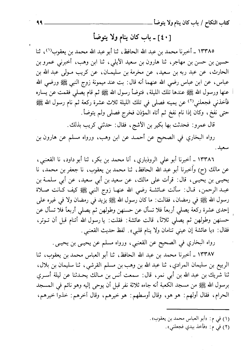 13385 - أَخْبَرَنَا مُحَمَّدُ بْنُ عَبْدِ اللهِ الْحَافِظُ، ثنا أَبُو عَبْدِ اللهِ مُحَمَّدُ بْنُ يَعْقُوبَ، ثنا حُسَيْنُ بْنُ حَسَنِ بْنِ مُهَاجِرٍ، ثنا هَارُونُ بْنُ سَعِيدٍ الْأَيْلِيُّ، ثنا ابْنُ وَهْبٍ، أَخْبَرَنِي عَمْرُو بْنُ الْحَارِثِ، عَنْ عَبْدِ رَبِّهِ بْنِ سَعِيدٍ، عَنْ مَخْرَمَةَ بْنِ سُلَيْمَانَ، عَنْ كُرَيْبٍ مَوْلَى عَبْدِ اللهِ بْنِ عَبَّاسٍ، عَنِ ابْنِ عَبَّاسٍ رَضِيَ اللهُ عَنْهُمَا أَنَّهُ قَالَ: بِتُّ عِنْدَ مَيْمُونَةَ زَوْجِ النَّبِيِّ صَلَّى اللهُ عَلَيْهِ وَسَلَّمَ وَرَضِيَ اللهُ عَنْهَا وَرَسُولُ اللهِ صَلَّى اللهُ عَلَيْهِ وَسَلَّمَ عِنْدَهَا تِلْكَ اللَّيْلَةَ، §فَتَوَضَّأَ رَسُولُ اللهِ صَلَّى اللهُ عَلَيْهِ وَسَلَّمَ ثُمَّ قَامَ يُصَلِّي فَقُمْتُ عَنْ يَسَارِهِ فَأَخَذَنِي، فَجَعَلَنِي عَنْ يَمِينِهِ، فَصَلَّى فِي تِلْكَ اللَّيْلَةِ ثَلَاثَ عَشْرَةَ رَكْعَةً، ثُمَّ نَامَ رَسُولُ اللهِ صَلَّى اللهُ عَلَيْهِ وَسَلَّمَ حَتَّى نَفَخَ، وَكَانَ إِذَا نَامَ نَفَخَ، ثُمَّ أَتَاهُ الْمُؤَذِّنُ فَخَرَجَ، فَصَلَّى وَلَمْ يَتَوَضَّأْ قَالَ عَمْرٌو: فَحَدَّثْتُ بِهَا بُكَيْرَ بْنَ الْأَشَجِّ فَقَالَ: حَدَّثَنِي كُرَيْبٌ بِذَلِكَ، رَوَاهُ الْبُخَارِيُّ فِي الصَّحِيحِ، عَنْ أَحْمَدَ عَنِ ابْنِ وَهْبٍ، وَرَوَاهُ مُسْلِمٌ عَنْ هَارُونَ بْنِ سَعِيدٍ