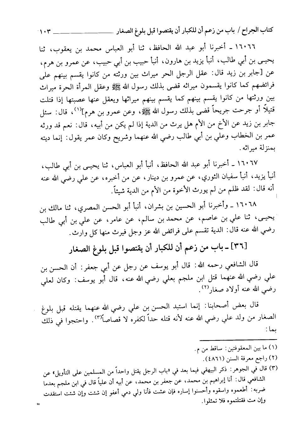 16068 - وَأَخْبَرَنَا أَبُو الْحُسَيْنِ بْنُ بِشْرَانَ، أنبأ أَبُو الْحَسَنِ الْمِصْرِيُّ، ثنا مَالِكُ بْنُ يَحْيَى، ثنا عَلِيُّ بْنُ عَاصِمٍ، عَنْ مُحَمَّدِ بْنِ سَالِمٍ، عَنْ عَامِرٍ، عَنْ عَلِيِّ بْنِ أَبِي طَالِبٍ، رَضِيَ اللهُ عَنْهُ، قَالَ: " §الدِّيَةُ تُقْسَمُ عَلَى فَرَائِضِ اللهِ عَزَّ وَجَلَّ، فَيَرِثُ مِنْهَا كُلُّ وَارِثٍ