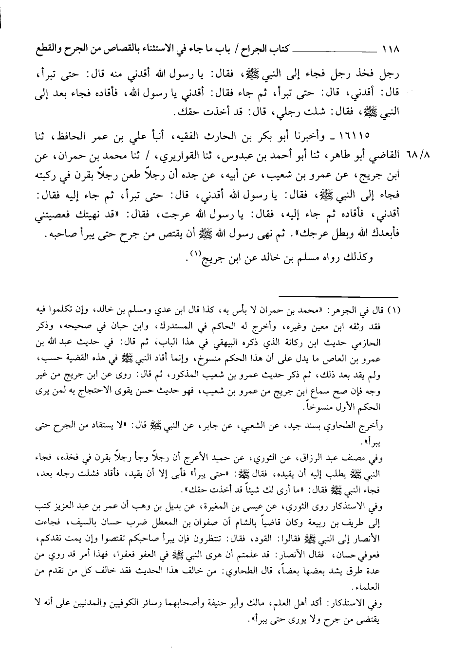 16115 - وَأَخْبَرَنَا أَبُو بَكْرِ بْنُ الْحَارِثِ الْفَقِيهُ، أنبأ عَلِيُّ بْنُ عُمَرَ الْحَافِظُ، ثنا الْقَاضِي أَبُو طَاهِرٍ، ثنا أَبُو أَحْمَدَ بْنُ عَبْدُوسٍ، ثنا الْقَوَارِيرِيُّ، ثنا مُحَمَّدُ بْنُ حُمْرَانَ، عَنِ ابْنِ جُرَيْجٍ، عَنْ عَمْرِو بْنِ شُعَيْبٍ، عَنْ أَبِيهِ، عَنْ جَدِّهِ، أَنَّ رَجُلًا طَعَنَ رَجُلًا بِقَرْنٍ فِي رُكْبَتِهِ فَجَاءَ إِلَى النَّبِيِّ صَلَّى اللهُ عَلَيْهِ وَسَلَّمَ فَقَالَ: يَا رَسُولَ اللهِ، أَقِدْنِي، قَالَ: " حَتَّى تَبْرَأَ " ثُمَّ جَاءَ إِلَيْهِ فَقَالَ: أَقِدْنِي، فَأَقَادَهُ، ثُمَّ جَاءَ إِلَيْهِ فَقَالَ: يَا رَسُولَ اللهِ، عَرَجْتُ، فَقَالَ: " قَدْ نَهَيْتُكَ فَعَصَيْتَنِي، فَأَبْعَدَكَ اللهُ وَبَطَلَ عَرَجُكَ " ثُمَّ §نَهَى رَسُولُ اللهِ صَلَّى اللهُ عَلَيْهِ وَسَلَّمَ أَنْ يُقْتَصَّ مِنْ جُرْحٍ حَتَّى يَبْرَأَ صَاحِبُهُ وَكَذَلِكَ رَوَاهُ مُسْلِمُ بْنُ خَالِدٍ، عَنِ ابْنِ جُرَيْجٍ