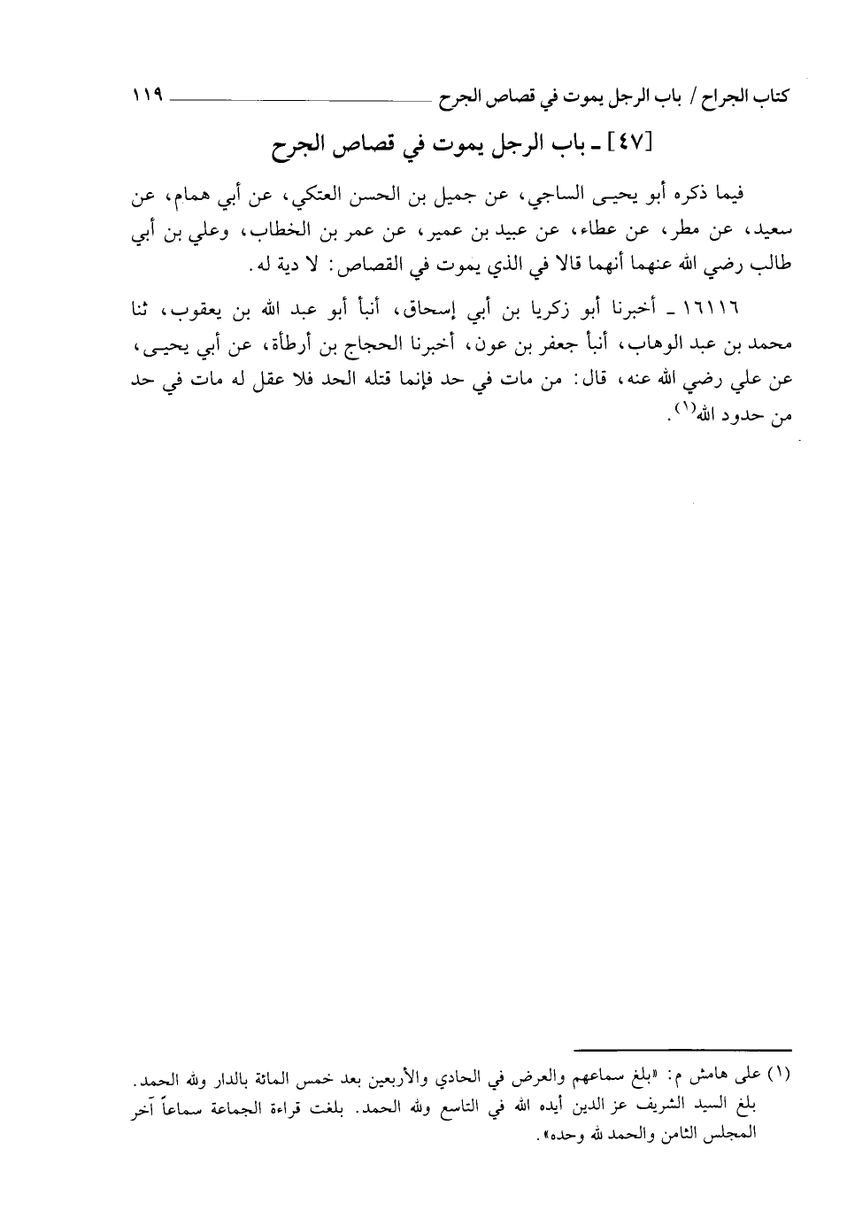 فِيمَا ذَكَرَهُ أَبُو يَحْيَى السَّاجِيُّ، عَنْ جَمِيلِ بْنِ الْحَسَنِ الْعَتَكِيِّ، عَنْ أَبِي هَمَّامٍ، عَنْ سَعِيدٍ، عَنْ مَطَرٍ، عَنْ عَطَاءٍ، عَنْ عُبَيْدِ بْنِ عُمَيْرٍ، عَنْ عُمَرَ بْنِ الْخَطَّابِ، وَعَلِيِّ بْنِ أَبِي طَالِبٍ رَضِيَ اللهُ عَنْهُمَا، أَنَّهُمَا قَالَا فِي الَّذِي يَمُوتُ فِي الْقِصَاصِ: لَا دِيَةَ لَهُ