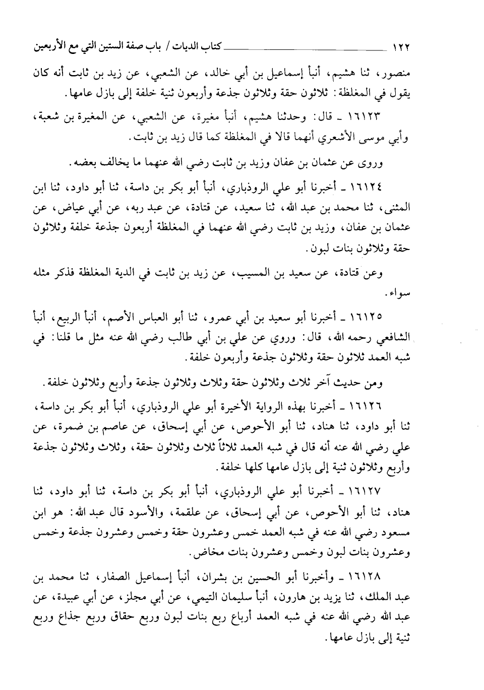 16126 - أَخْبَرَنَا بِهَذِهِ الرِّوَايَةِ الْأَخِيرَةِ أَبُو عَلِيٍّ الرُّوذْبَارِيُّ، أنبأ أَبُو بَكْرِ بْنُ دَاسَةَ، ثنا أَبُو دَاوُدَ، ثنا هَنَّادٌ، ثنا أَبُو الْأَحْوَصِ، عَنْ أَبِي إِسْحَاقَ، عَنْ عَاصِمِ بْنِ ضَمْرَةَ، عَنْ عَلِيٍّ، رَضِيَ اللهُ عَنْهُ، أَنَّهُ قَالَ §فِي شِبْهِ الْعَمْدِ أثَلَاثٌ: ثَلَاثٌ وَثَلَاثُونَ حِقَّةً، وَثَلَاثٌ وَثَلَاثُونَ جَذَعَةً، وَأَرْبَعٌ وَثَلَاثُونَ ثَنِيَّةً إِلَى بَازِلِ عَامِهَا، كُلُّهَا خَلِفَةٌ