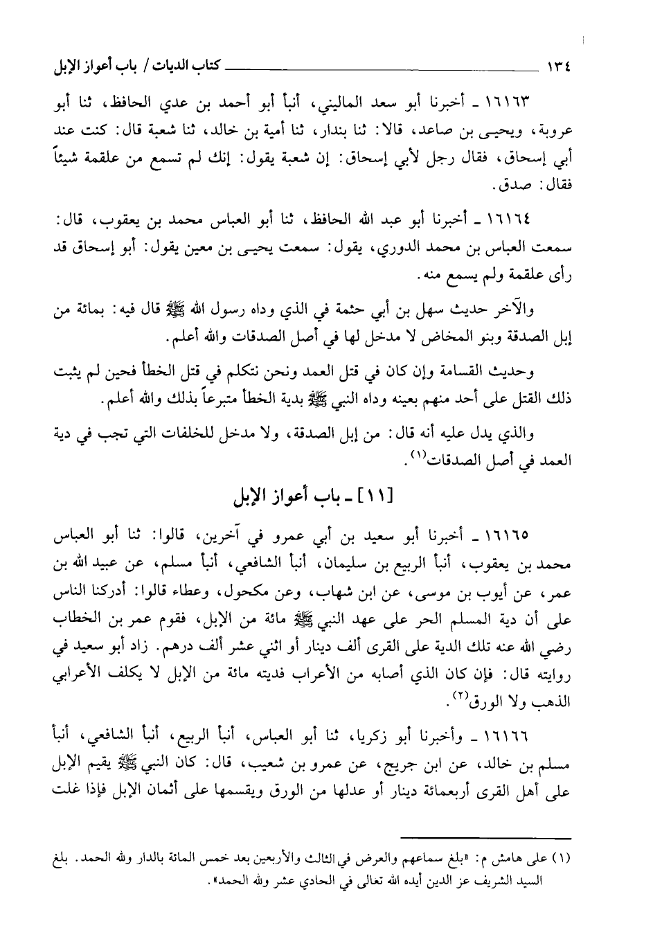 16165 - أَخْبَرَنَا أَبُو سَعِيدِ بْنُ أَبِي عَمْرٍو، فِي آخَرِينَ، قَالُوا: ثنا أَبُو الْعَبَّاسِ مُحَمَّدُ بْنُ يَعْقُوبَ، أنبأ الرَّبِيعُ بْنُ سُلَيْمَانَ، أنبأ الشَّافِعِيُّ، أنبأ مُسْلِمٌ، عَنْ عُبَيْدِ اللهِ بْنِ عُمَرَ، عَنْ أَيُّوبَ بْنِ مُوسَى، عَنِ ابْنِ شِهَابٍ، وَعَنْ مَكْحُولٍ، وَعَطَاءٍ، قَالُوا: أَدْرَكْنَا النَّاسَ عَلَى أَنَّ §دِيَةَ الْمُسْلِمِ الْحُرِّ عَلَى عَهْدِ النَّبِيِّ صَلَّى اللهُ عَلَيْهِ وَسَلَّمَ مِائَةٌ مِنَ الْإِبِلِ فَقَوَّمَ عُمَرُ بْنُ الْخَطَّابِ رَضِيَ اللهُ عَنْهُ تِلْكَ الدِّيَةَ عَلَى الْقُرَى أَلْفَ دِينَارٍ، أَوِ اثْنَيْ عَشَرَ أَلْفَ دِرْهَمٍ زَادَ أَبُو سَعِيدٍ فِي رِوَايَتِهِ، قَالَ: فَإِنْ كَانَ الَّذِي أَصَابَهُ مِنَ الْأَعْرَابِ فَدِيَتُهُ مِائَةٌ مِنَ الْإِبِلِ لَا يُكَلَّفُ الْأَعْرَابِيُّ الذَّهَبَ وَلَا الْوَرِقَ