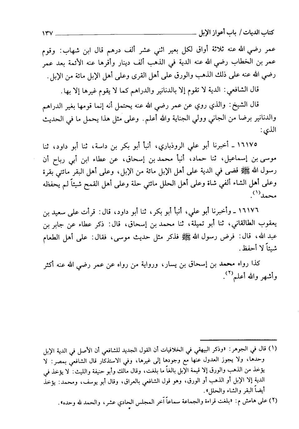 16175 - أَخْبَرَنَا أَبُو عَلِيٍّ الرُّوذْبَارِيُّ، أنبأ أَبُو بَكْرِ بْنُ دَاسَةَ، ثنا أَبُو دَاوُدَ، ثنا مُوسَى بْنُ إِسْمَاعِيلَ، ثنا حَمَّادٌ، أنبأ مُحَمَّدُ بْنُ إِسْحَاقَ، عَنْ عَطَاءِ بْنِ أَبِي رَبَاحٍ، أَنَّ رَسُولَ اللهِ صَلَّى اللهُ عَلَيْهِ وَسَلَّمَ قَضَى فِي §الدِّيَةِ عَلَى أَهْلِ الْإِبِلِ مِائَةً مِنَ الْإِبِلِ، وَعَلَى أَهْلِ الْبَقَرِ مِائَتَيْ بَقَرَةٍ، وَعَلَى أَهْلِ الشَّاءِ أَلْفَيْ شَاةٍ، وَعَلَى أَهْلِ الْحُلَلِ مِائَتَيْ حُلَّةٍ، وَعَلَى أَهْلِ الْقَمْحِ شَيْئًا لَمْ يَحْفَظْهُ مُحَمَّدٌ