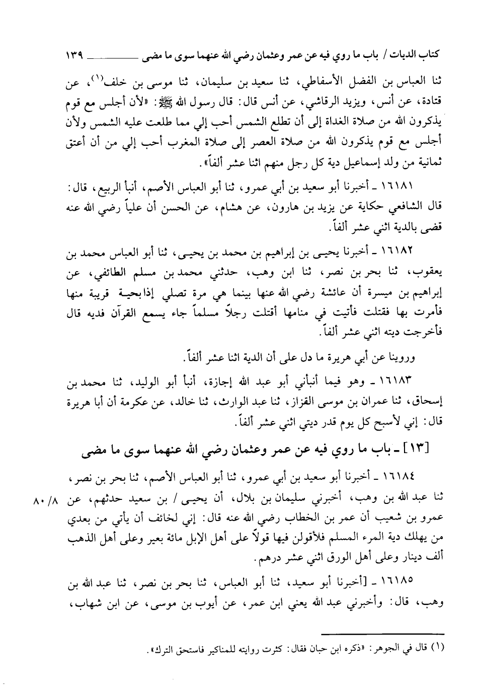 16184 - أَخْبَرَنَا أَبُو سَعِيدِ بْنُ أَبِي عَمْرٍو، ثنا أَبُو الْعَبَّاسِ الْأَصَمُّ، ثنا بَحْرُ بْنُ نَصْرٍ، ثنا عَبْدُ اللهِ بْنُ وَهْبٍ، أَخْبَرَنِي سُلَيْمَانُ بْنُ بِلَالٍ، أَنَّ يَحْيَى بْنَ سَعِيدٍ، حَدَّثَهُمْ، عَنْ عَمْرِو بْنِ شُعَيْبٍ، أَنَّ عُمَرَ بْنَ الْخَطَّابِ، رَضِيَ اللهُ عَنْهُ، قَالَ: إِنِّي لَخَائِفٌ أَنْ يَأْتِيَ مِنْ بَعْدِي مَنْ يُهْلِكُ دِيَةَ الْمَرْءِ الْمُسْلِمِ، فَلَأَقُولَنَّ فِيهَا قَوْلًا: §عَلَى أَهْلِ الْإِبِلِ مِائَةُ بَعِيرٍ وَعَلَى أَهْلِ الذَّهَبِ أَلْفُ دِينَارٍ، وَعَلَى أَهْلِ الْوَرِقِ اثْنَا عَشَرَ دِرْهَمًا