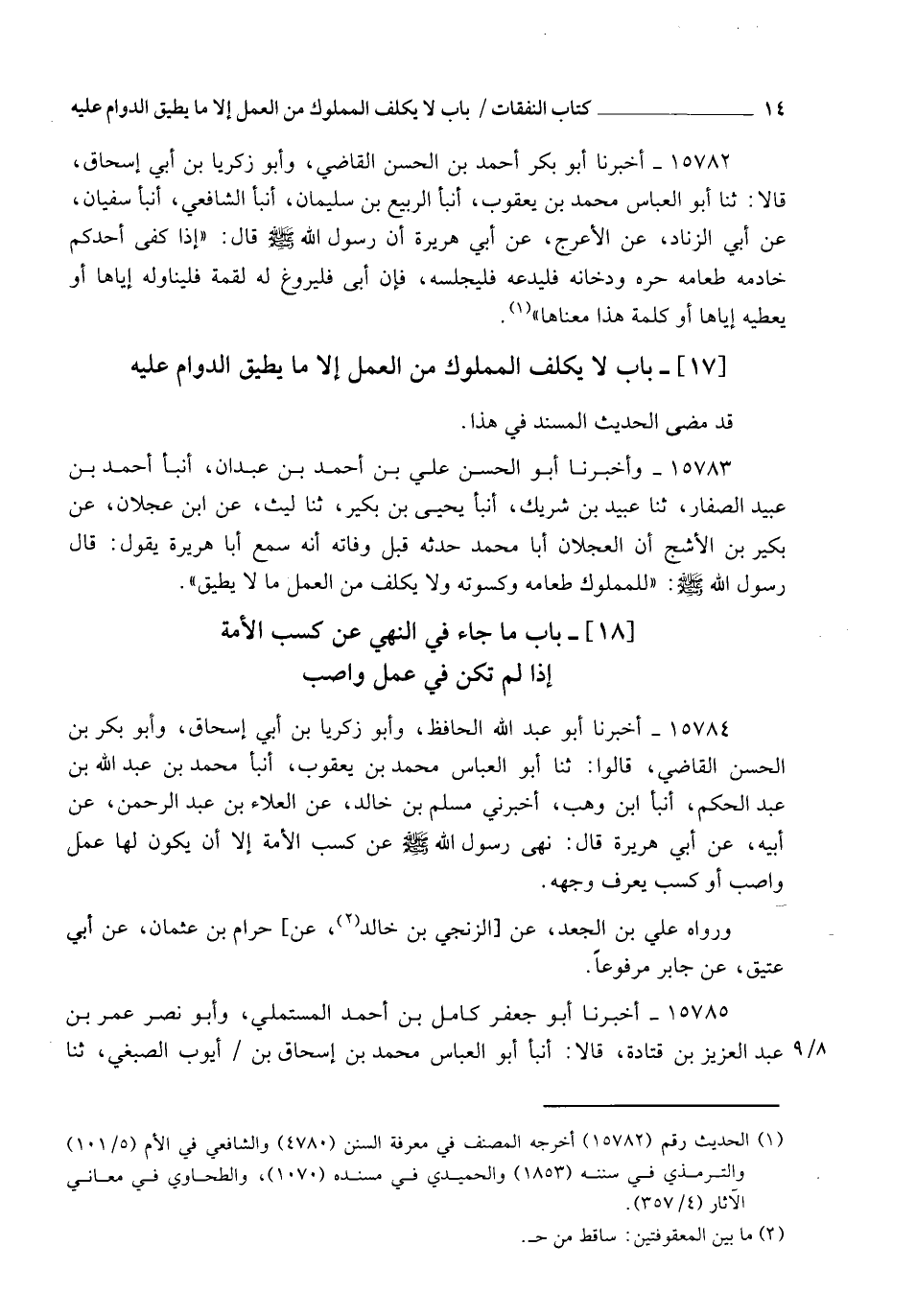 15784 - أَخْبَرَنَا أَبُو عَبْدِ اللهِ الْحَافِظُ، وَأَبُو زَكَرِيَّا بْنُ أَبِي إِسْحَاقَ، وَأَبُو بَكْرِ بْنُ الْحَسَنِ الْقَاضِي قَالُوا: ثنا أَبُو الْعَبَّاسِ مُحَمَّدُ بْنُ يَعْقُوبَ، أنبأ مُحَمَّدُ بْنُ عَبْدِ اللهِ بْنِ عَبْدِ الْحَكَمِ، أنبأ ابْنُ وَهْبٍ، أَخْبَرَنِي مُسْلِمُ بْنُ خَالِدٍ، عَنِ الْعَلَاءِ بْنِ عَبْدِ الرَّحْمَنِ، عَنْ أَبِيهِ، عَنْ أَبِي هُرَيْرَةَ، قَالَ: §نَهَى رَسُولُ اللهِ صَلَّى اللهُ عَلَيْهِ وَسَلَّمَ، عَنْ كَسْبِ الْأَمَةِ، إِلَّا أَنْ يَكُونَ لَهَا عَمَلٌ وَاصِبٌ، أَوْ كَسْبٌ يُعْرَفُ وَجْهُهُ. وَرَوَاهُ عَلِيُّ بْنُ الْجَعْدِ، عَنِ الزَّنْجِيِّ بْنِ خَالِدٍ، عَنْ حَرَامِ بْنِ عُثْمَانَ، عَنْ أَبِي عَتِيقٍ، عَنْ جَابِرٍ مَرْفُوعًا