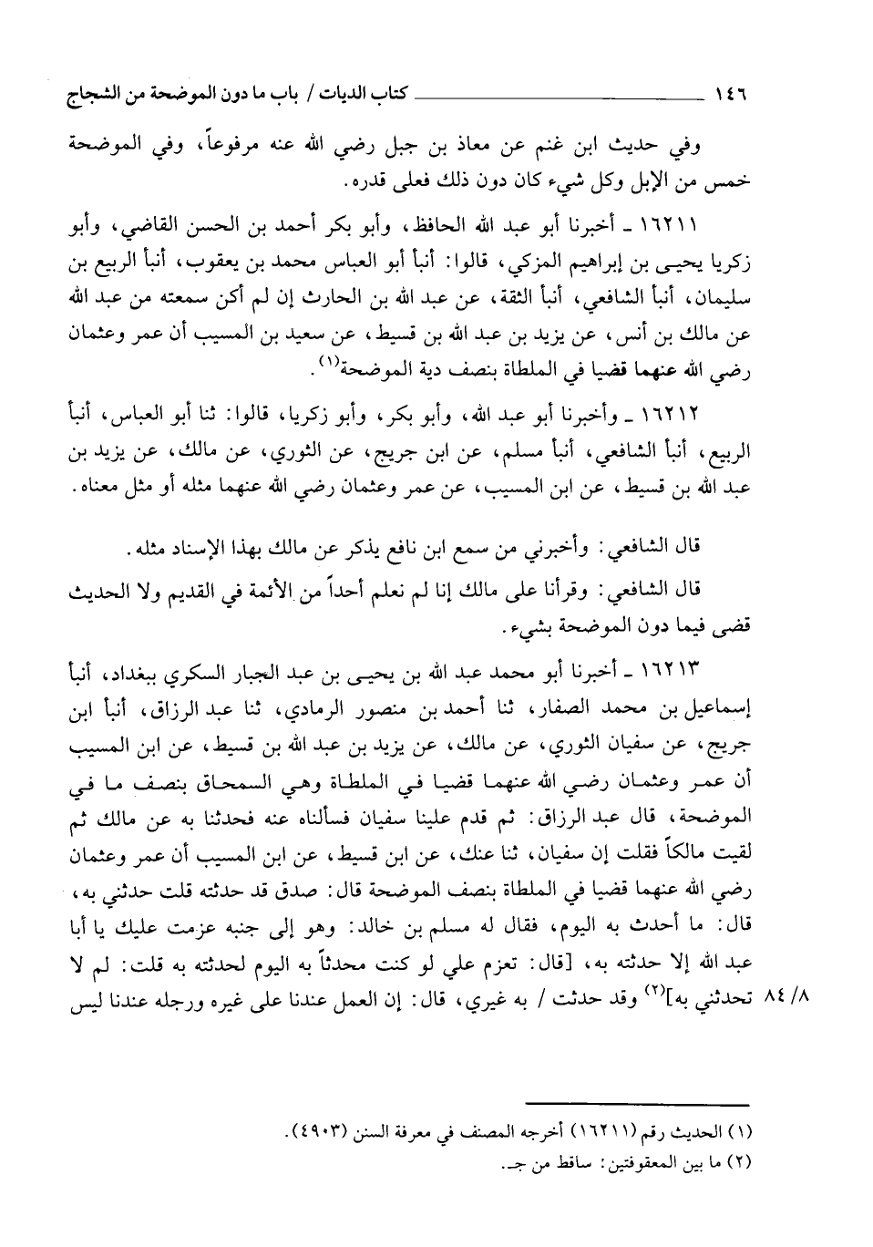 16212 - وَأَخْبَرَنَا أَبُو عَبْدِ اللهِ، وَأَبُو بَكْرٍ، وَأَبُو زَكَرِيَّا، قَالُوا: ثنا أَبُو الْعَبَّاسِ، أنبأ الرَّبِيعُ، أنبأ الشَّافِعِيُّ، أنبأ مُسْلِمٌ، عَنِ ابْنِ جُرَيْجٍ، عَنِ الثَّوْرِيِّ، عَنْ مَالِكٍ، عَنْ يَزِيدَ بْنِ عَبْدِ اللهِ بْنِ قُسَيْطٍ، عَنِ ابْنِ الْمُسَيِّبِ، عَنْ عُمَرَ، وَعُثْمَانَ، رَضِيَ اللهُ عَنْهُمَا مِثْلَهُ أَوْ مِثْلَ مَعْنَاهُ قَالَ الشَّافِعِيُّ: وَأَخْبَرَنِي مَنْ سَمِعَ ابْنَ نَافِعٍ يَذْكُرُ عَنْ مَالِكٍ بِهَذَا الْإِسْنَادِ مِثْلَهُ قَالَ الشَّافِعِيُّ: وَقَرَأْنَا عَلَى مَالِكٍ: إِنَّا لَمْ نَعْلَمْ أَحَدًا مِنَ الْأَئِمَّةِ فِي الْقَدِيمِ وَلَا الْحَدِيثِ قَضَى فِيمَا دُونَ الْمُوَضِّحَةِ بِشَيْءٍ
