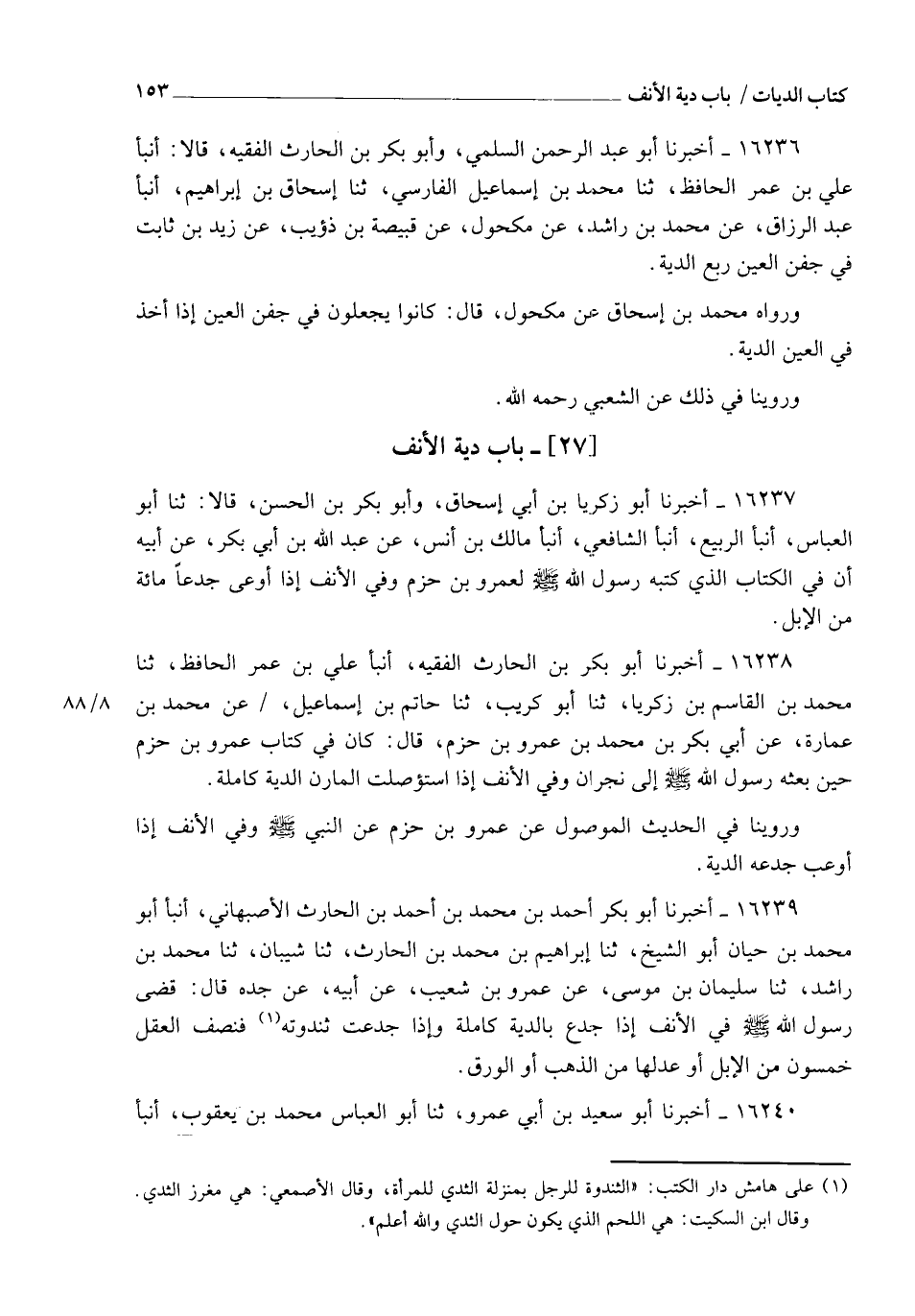 16238 - أَخْبَرَنَا أَبُو بَكْرِ بْنُ الْحَارِثِ الْفَقِيهُ، أنبأ عَلِيُّ بْنُ عُمَرَ الْحَافِظُ، ثنا مُحَمَّدُ بْنُ الْقَاسِمِ بْنِ زَكَرِيَّا، ثنا أَبُو كُرَيْبٍ، ثنا حَاتِمُ بْنُ إِسْمَاعِيلَ، عَنْ مُحَمَّدِ بْنِ عُمَارَةَ، عَنْ أَبِي بَكْرِ بْنُ مُحَمَّدِ بْنِ عَمْرِو بْنِ حَزْمٍ، قَالَ: كَانَ فِي كِتَابِ عَمْرِو بْنِ حَزْمٍ حِينَ بَعَثَهُ رَسُولُ اللهِ صَلَّى اللهُ عَلَيْهِ وَسَلَّمَ إِلَى نَجْرَانَ: §" وَفِي الْأَنْفِ إِذَا اسْتُؤْصِلَتِ الْمَارِنُ الدِّيَةُ كَامِلَةً " وَرُوِّينَا فِي الْحَدِيثِ الْمَوْصُولِ، عَنْ عَمْرِو بْنِ حَزْمٍ، عَنِ النَّبِيِّ صَلَّى اللهُ عَلَيْهِ وَسَلَّمَ: وَفِي الْأَنْفِ إِذَا أُوعِبَ جَدْعُهُ الدِّيَةُ