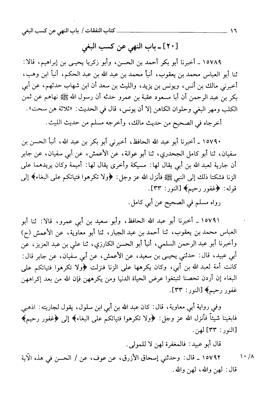 15790 - أَخْبَرَنَا أَبُو عَبْدِ اللهِ الْحَافِظُ، أَخْبَرَنِي أَبُو بَكْرِ بْنُ عَبْدِ اللهِ، أنبأ الْحَسَنُ بْنُ سُفْيَانَ، ثنا أَبُو كَامِلٍ الْجَحْدَرِيُّ، ثنا أَبُو عَوَانَةَ، عَنِ الْأَعْمَشِ، عَنْ أَبِي سُفْيَانَ، عَنْ جَابِرٍ، أَنَّ جَارِيَةً لِعَبْدِ اللهِ بْنِ أُبَيٍّ يُقَالُ لَهَا مُسَيْكَةُ، وَأُخْرَى يُقَالُ لَهَا أُمَيْمَةُ، وَكَانَ يُرِيدُهُمَا عَلَى الزِّنَا فَشَكَتَا ذَلِكَ إِلَى النَّبِيِّ صَلَّى اللهُ عَلَيْهِ وَسَلَّمَ، §فَأَنْزَلَ اللهُ عَزَّ وَجَلَّ " {وَلَا تُكْرِهُوا فَتَيَاتِكُمْ عَلَى الْبِغَاءِ} [النور: 33]، إِلَى قَوْلِهِ {غَفُورٌ رَحِيمٌ} [البقرة: 173]. رَوَاهُ مُسْلِمٌ فِي الصَّحِيحِ، عَنْ أَبِي كَامِلٍ