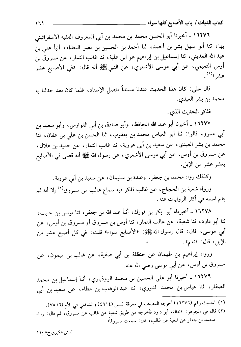16276 - أَخْبَرَنَا أَبُو الْحَسَنِ مُحَمَّدُ بْنُ مُحَمَّدِ بْنِ أَبِي الْمَعْرُوفِ الْفَقِيهُ الْإِسْفَرَايِينِيُّ بِهَا، ثنا أَبُو سَهْلٍ بِشْرُ بْنُ أَحْمَدَ، ثنا أَحْمَدُ بْنُ الْحُسَيْنِ بْنِ نَصْرٍ الْحَذَّاءُ، أنبأ عَلِيُّ بْنُ عَبْدِ اللهِ الْمَدِينِيُّ، ثنا إِسْمَاعِيلُ بْنُ إِبْرَاهِيمَ هُوَ ابْنُ عُلَيَّةَ، ثنا غَالِبٌ التَّمَّارُ، عَنْ مَسْرُوقِ بْنِ أَوْسٍ التَّمِيمِيِّ، عَنْ أَبِي مُوسَى الْأَشْعَرِيِّ، عَنِ النَّبِيِّ صَلَّى اللهُ عَلَيْهِ وَسَلَّمَ أَنَّهُ قَالَ: " §فِي الْأَصَابِعِ عَشْرٌ عَشْرٌ " قَالَ عَلِيٌّ: كَانَ هَذَا الْحَدِيثُ عِنْدَنَا مُسْنَدًا مُتَّصِلَ الْإِسْنَادِ، فَلَمَّا كَانَ بَعْدُ حَدَّثَنَا بِهِ مُحَمَّدُ بْنُ بِشْرٍ الْعَبْدِيُّ، فَذَكَرَ الْحَدِيثَ الَّذِي