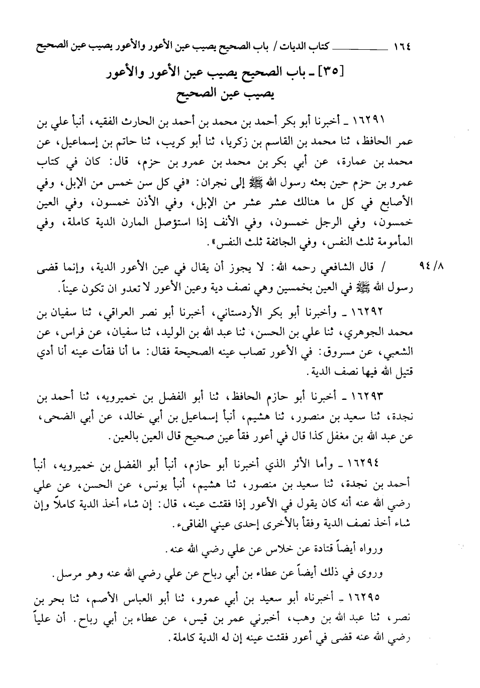 16291 - أَخْبَرَنَا أَبُو بَكْرٍ أَحْمَدُ بْنُ مُحَمَّدِ بْنِ أَحْمَدَ بْنِ الْحَارِثِ الْفَقِيهُ، أنبأ عَلِيُّ بْنُ عُمَرَ الْحَافِظُ، ثنا مُحَمَّدُ بْنُ الْقَاسِمِ بْنِ زَكَرِيَّا، ثنا أَبُو كُرَيْبٍ، ثنا حَاتِمُ بْنُ إِسْمَاعِيلَ، عَنْ مُحَمَّدِ بْنِ عُمَارَةَ، عَنْ أَبِي بَكْرِ بْنِ مُحَمَّدِ بْنِ عَمْرِو بْنِ حَزْمٍ، قَالَ: كَانَ فِي كِتَابِ عَمْرِو بْنِ حَزْمٍ، حِينَ بَعَثَهُ رَسُولُ اللهِ صَلَّى اللهُ عَلَيْهِ وَسَلَّمَ إِلَى نَجْرَانَ: " فِي §كُلِّ سِنٍّ خَمْسٌ مِنَ الْإِبِلِ، وَفِي الْأَصَابِعِ فِي كُلِّ مَا هُنَالِكَ عَشْرٌ عَشْرٌ مِنَ الْإِبِلِ، وَفِي الْأُذُنِ خَمْسُونَ، وَفِي الْعَيْنِ خَمْسُونَ، وَفِي الرِّجْلِ خَمْسُونَ، وَفِي الْأَنْفِ إِذَا اسْتُؤْصِلَ الْمَارِنُ الدِّيَةُ كَامِلَةً، وَفِي الْمَأْمُومَةِ ثُلُثُ النَّفْسِ، وَفِي الْجَائِفَةِ ثُلُثُ النَّفْسِ " قَالَ الشَّافِعِيُّ رَحِمَهُ اللهُ: لَا يَجُوزُ أَنْ يُقَالَ: فِي عَيْنِ الْأَعْوَرِ الدِّيَةُ، وَإِنَّمَا قَضَى رَسُولُ اللهِ صَلَّى اللهُ عَلَيْهِ وَسَلَّمَ فِي الْعَيْنِ بِخَمْسِينَ، وَهِيَ نِصْفُ دِيَةٍ، وَعَيْنُ الْأَعْوَرِ لَا تَعْدُو أَنْ تَكُونَ عَيْنًا