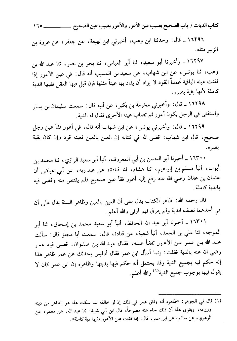 16301 - أَخْبَرَنَا أَبُو عَبْدِ اللهِ الْحَافِظُ، أنبأ أَبُو سَعِيدٍ مُحَمَّدُ بْنُ إِسْحَاقَ، ثنا أَبُو الْمُوَجِّهِ، ثنا عَلِيُّ بْنُ الْجَعْدِ، أنبأ شُعْبَةُ، عَنْ قَتَادَةَ، قَالَ: سَمِعْتُ أَبَا مِجْلَزٍ، قَالَ: سَأَلْتُ عَبْدَ اللهِ بْنَ عُمَرَ عَنِ §الْأَعْوَرِ، تُفْقَأُ عَيْنُهُ؟ فَقَالَ عَبْدُ اللهِ بْنُ صَفْوَانَ: قَضَى فِيهِ عُمَرُ رَضِيَ اللهُ عَنْهُ بِالدِّيَةِ، فَقُلْتُ: إِنَّمَا أَسْأَلُ ابْنَ عُمَرَ، فَقَالَ: أَوَلَيْسَ يُحَدِّثُكَ عَنْ عُمَرَ؟ ظَاهِرُ هَذَا أَنَّهُ حَكَمَ فِيهِ بِجَمِيعِ الدِّيَةِ وَقَدْ يُحْتَمَلُ أَنَّهُ حَكَمَ فِيهَا بِدِيَتِهَا، وَظَاهِرُهُ أَنَّ ابْنَ عُمَرَ كَانَ لَا يَقُولُ فِيهَا بِوجُوبِ جَمِيعِ الدِّيَةِ، وَاللهُ أَعْلَمُ