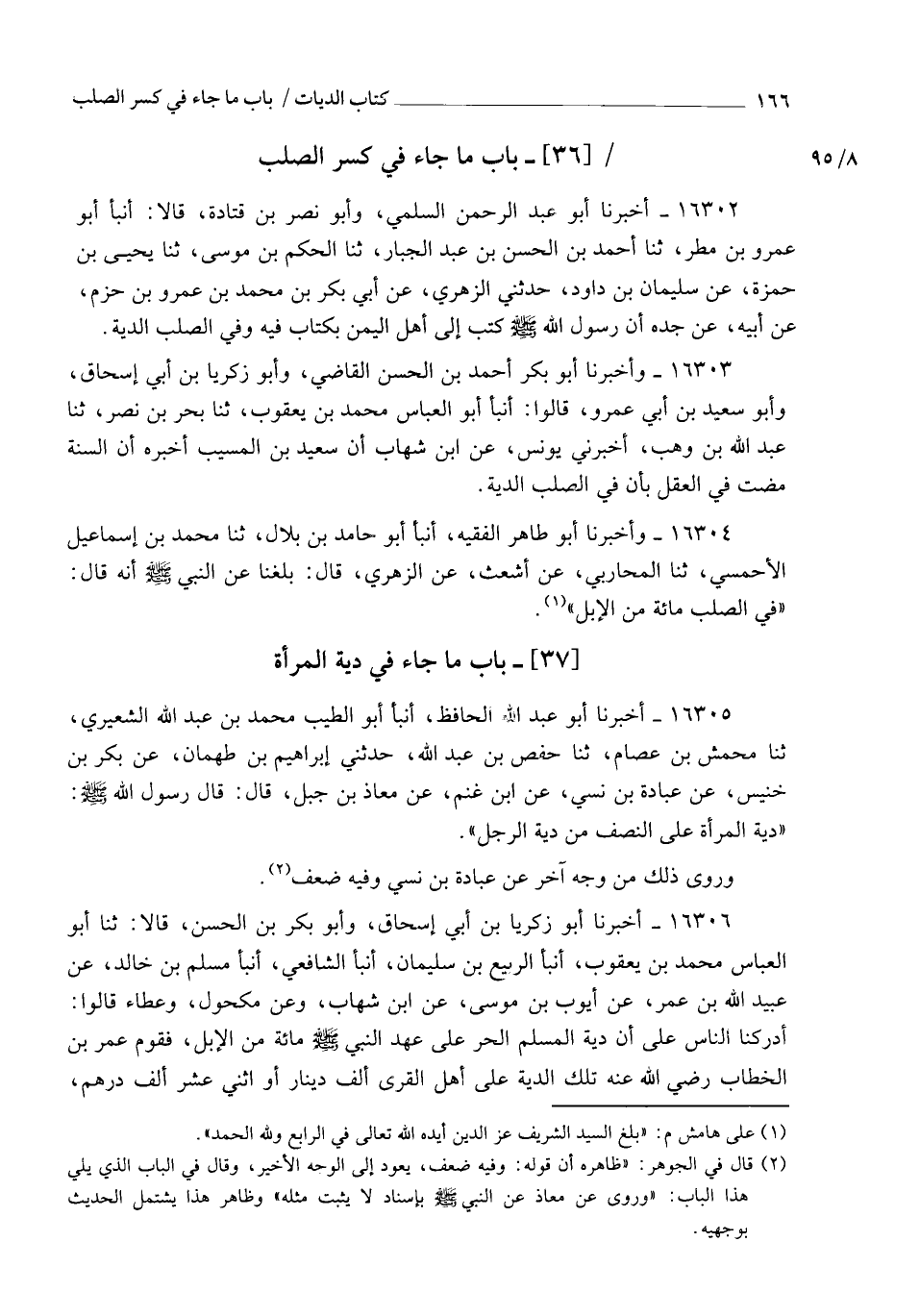 16302 - أَخْبَرَنَا أَبُو عَبْدِ الرَّحْمَنِ السُّلَمِيُّ، وَأَبُو نَصْرِ بْنُ قَتَادَةَ، قَالَا: أنبأ أَبُو عَمْرِو بْنُ مَطَرٍ، ثنا أَحْمَدُ بْنُ الْحَسَنِ بْنِ عَبْدِ الْجَبَّارِ، ثنا الْحَكَمُ بْنُ مُوسَى، ثنا يَحْيَى بْنُ حَمْزَةَ، عَنْ سُلَيْمَانَ بْنِ دَاوُدَ، حَدَّثَنِي الزُّهْرِيُّ، عَنْ أَبِي بَكْرِ بْنُ مُحَمَّدِ بْنِ عَمْرِو بْنِ حَزْمٍ، عَنْ أَبِيهِ، عَنْ جَدِّهِ، أَنَّ رَسُولَ اللهِ صَلَّى اللهُ عَلَيْهِ وَسَلَّمَ: كَتَبَ إِلَى أَهْلِ الْيَمَنِ بِكِتَابٍ فِيهِ: §" وَفِي الصُّلْبِ الدِّيَةُ "