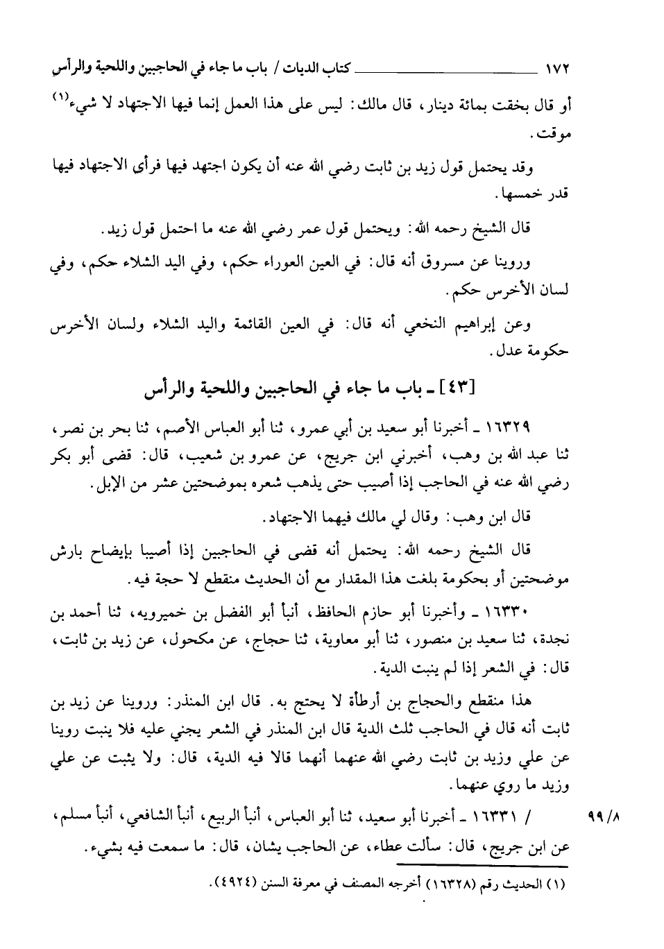 16329 - أَخْبَرَنَا أَبُو سَعِيدِ بْنُ أَبِي عَمْرٍو، ثنا أَبُو الْعَبَّاسِ الْأَصَمُّ، ثنا بَحْرُ بْنُ نَصْرٍ، ثنا عَبْدُ اللهِ بْنُ وَهْبٍ، أَخْبَرَنِي ابْنُ جُرَيْجٍ، عَنْ عَمْرِو بْنِ شُعَيْبٍ، قَالَ: قَضَى أَبُو بَكْرٍ رَضِيَ اللهُ عَنْهُ، §فِي الْحَاجِبِ إِذَا أُصِيبَ حَتَّى يَذْهَبَ شَعْرُهُ بِمُوضِحَتَيْنِ عَشْرٍ مِنَ الْإِبِلِ، قَالَ ابْنُ وَهْبٍ: وَقَالَ لِي مَالِكٌ: فِيهِمَا الِاجْتِهَادُ قَالَ الشَّيْخُ رَحِمَهُ اللهُ: يُحْتَمَلُ أَنَّهُ قَضَى فِي الْحَاجِبَيْنِ إِذَا أُصِيبَا بِإِيضَاحٍ بِأَرْشِ مُوضِحَتَيْنِ، أَوْ بِحُكُومَةٍ بَلَغَتْ هَذَا الْمِقْدَارَ، مَعَ أَنَّ الْحَدِيثَ مُنْقَطِعٌ لَا حُجَّةَ فِيهِ