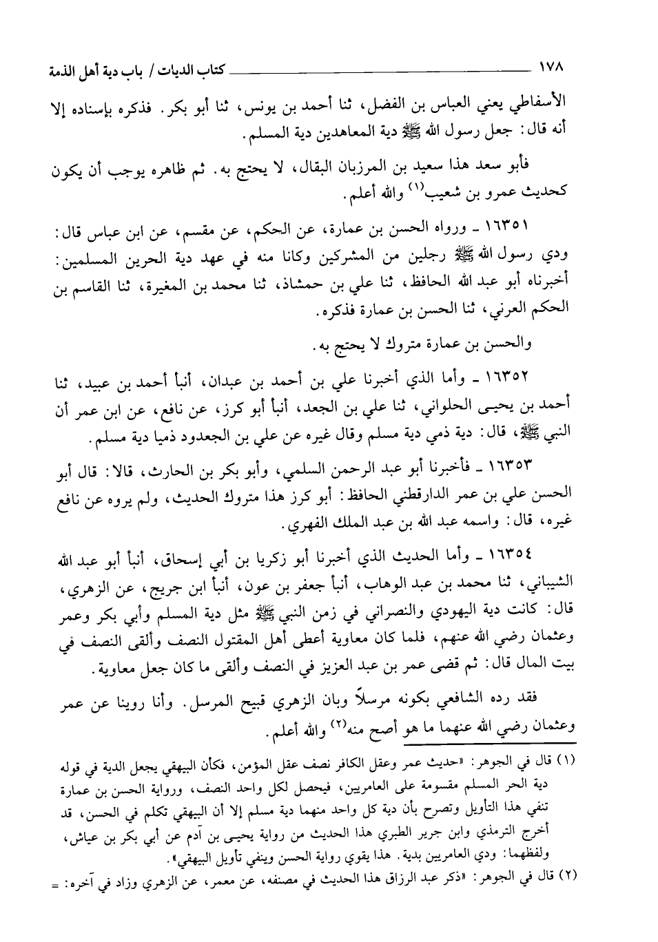 16354 - وَأَمَّا الْحَدِيثُ الَّذِي أَخْبَرَنَا أَبُو زَكَرِيَّا بْنُ أَبِي إِسْحَاقَ، أنبأ أَبُو عَبْدِ اللهِ الشَّيْبَانِيُّ، ثنا مُحَمَّدُ بْنُ عَبْدِ الْوَهَّابِ، أنبأ جَعْفَرُ بْنُ عَوْنٍ، أنبأ ابْنُ جُرَيْجٍ، عَنِ الزُّهْرِيِّ، قَالَ: كَانَتْ §دِيَةُ الْيَهُودِيِّ وَالنَّصْرَانِيِّ فِي زَمَنِ النَّبِيِّ صَلَّى اللهُ عَلَيْهِ وَسَلَّمَ، مِثْلَ دِيَةِ الْمُسْلِمِ، وَأَبِي بَكْرٍ، وَعُمَرَ، وَعُثْمَانَ رَضِيَ اللهُ عَنْهُمْ، فَلَمَّا كَانَ مُعَاوِيَةُ أَعْطَى أَهْلَ الْمَقْتُولِ النِّصْفَ وَأَلْقَى النِّصْفَ فِي بَيْتِ الْمَالِ، قَالَ: ثُمَّ قَضَى عُمَرُ بْنُ عَبْدِ الْعَزِيزِ فِي النِّصْفِ، وَأَلْقَى مَا كَانَ جَعَلَ مُعَاوِيَةُ فَقَدْ رَدَّهُ الشَّافِعِيُّ بِكَوْنِهِ مُرْسَلًا، وَبِأَنَّ الزُّهْرِيَّ قَبِيحُ الْمُرْسَلِ وَأَنَّا رُوِّينَا عَنْ عُمَرَ وَعُثْمَانَ رَضِيَ اللهُ عَنْهُمَا مَا هُوَ أَصَحُّ مِنْهُ، وَاللهُ أَعْلَمُ